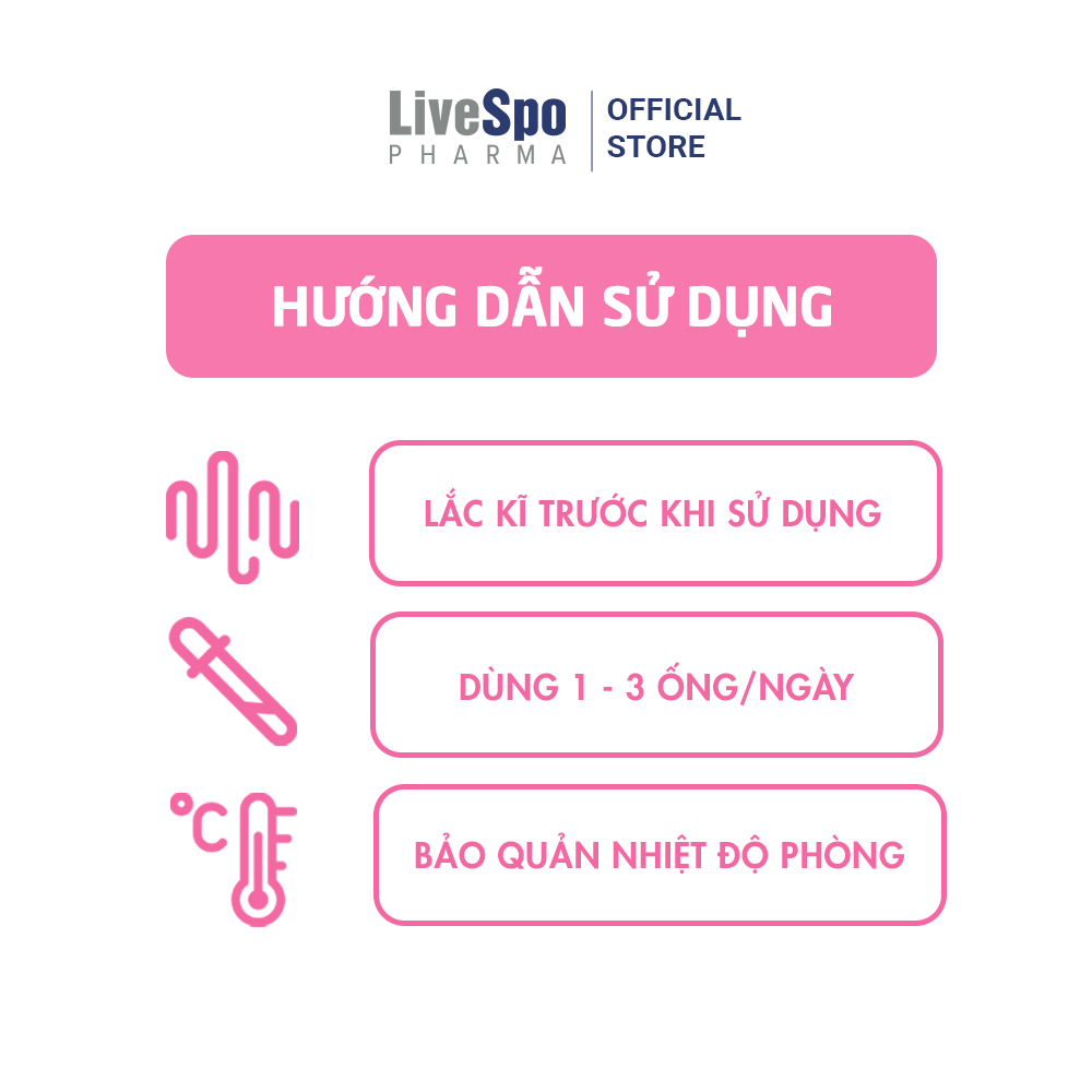 - Sử dụng liên tục từ 1-3 tháng hoặc dài hơn ( tùy theo thể trạng và mức độ đáp ứng của cơ thể) để đạt được hiệu quả tốt Công ty LiveSpo với sứ mệnh: "Vì một tương lai không kháng sinh", là đơn vị tiên phong trong ngành khoa học về bào tử lợi khuẩn, đã mở ra một cuộc cách mạng mới trong lĩnh vực chăm sóc sức khỏe, giúp hiện thực hóa ước mơ xây dựng một cuộc sống khỏe mạnh không kháng sinh. Các sản phẩm của LiveSpo đã được kiểm nghiệm lâm sàng và có giấy chứng nhận bởi FDA Hoa Kỳ đưa sản phẩm bào tử lợi khuẩn có mặt tại 25 quốc gia trên toàn thế giới.