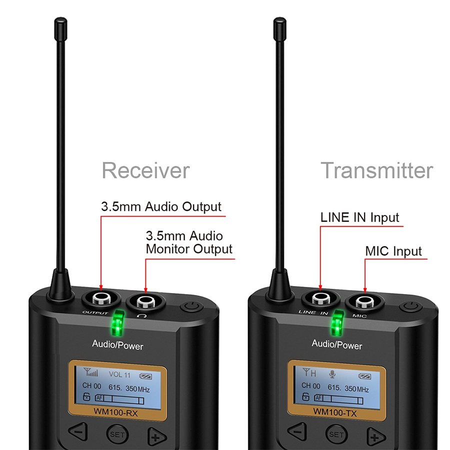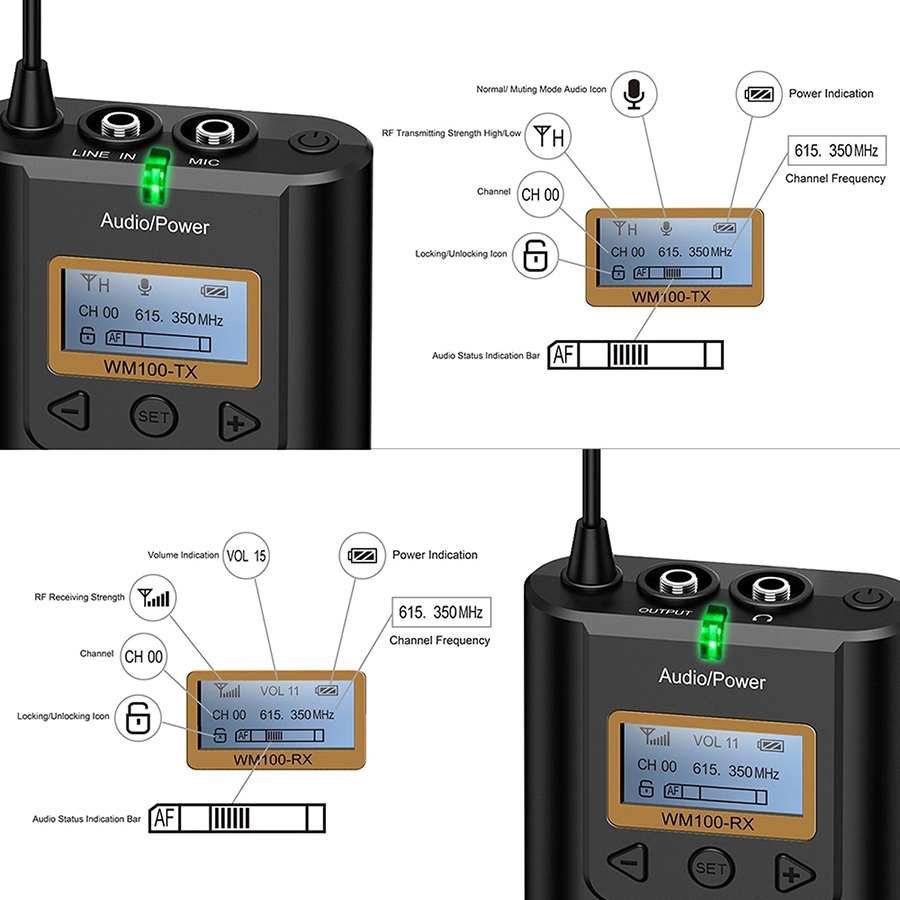 - Sóng UHF với 48 kênh có dải tần riêng, cho khả năng ghi âm với cự ly lên tới 100m và tránh lẫn sóng khi có nhiều bộ thu phát cùng sử dụng trong 1 khu vực.