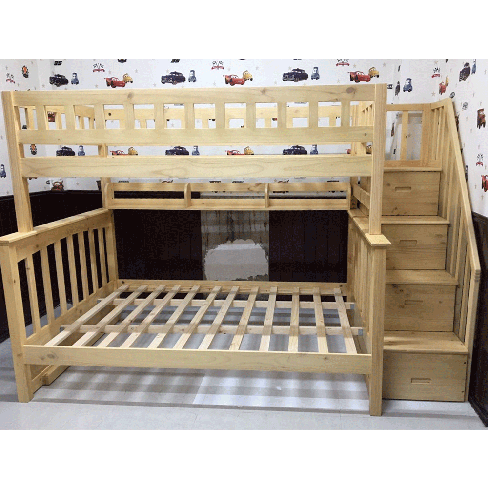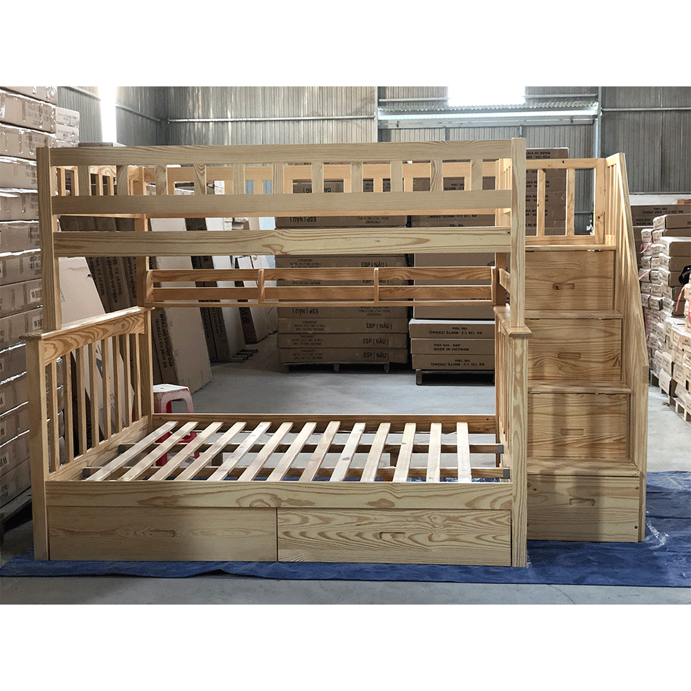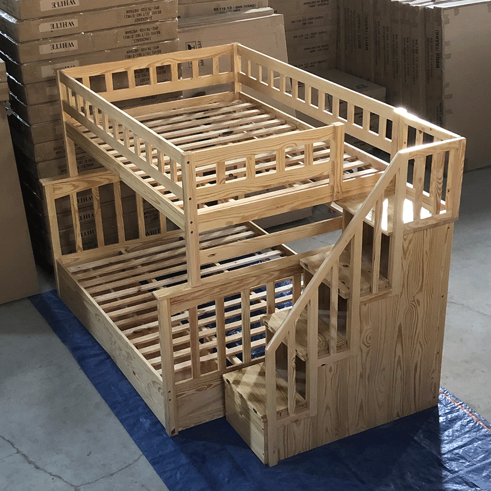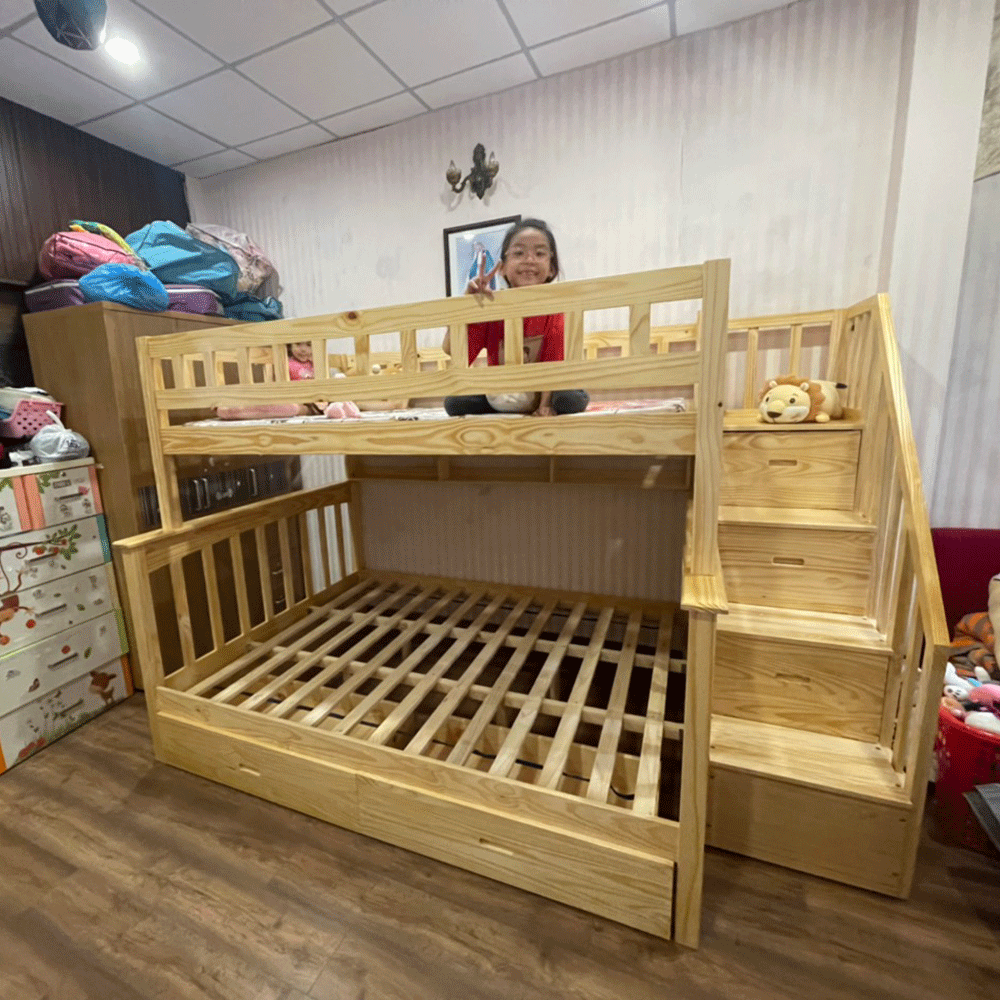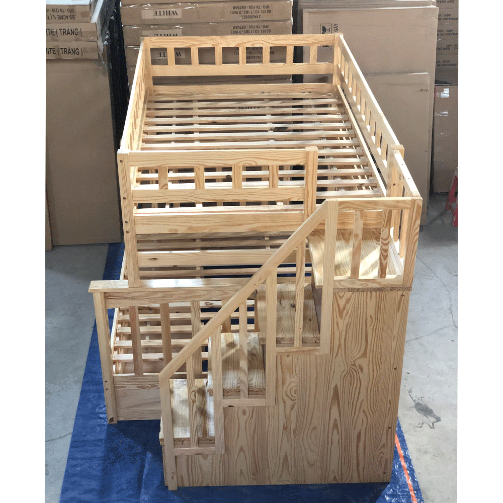 + Chất liệu: Khung giường gỗ thông Newzealand, phân tầng, Vách, đáy hộc gỗ công nghiệp, thang giường MDF chịu lực + Kích thước: kích thước phủ bì, tầng trên ưới 1mx2m Giường tầng hộp