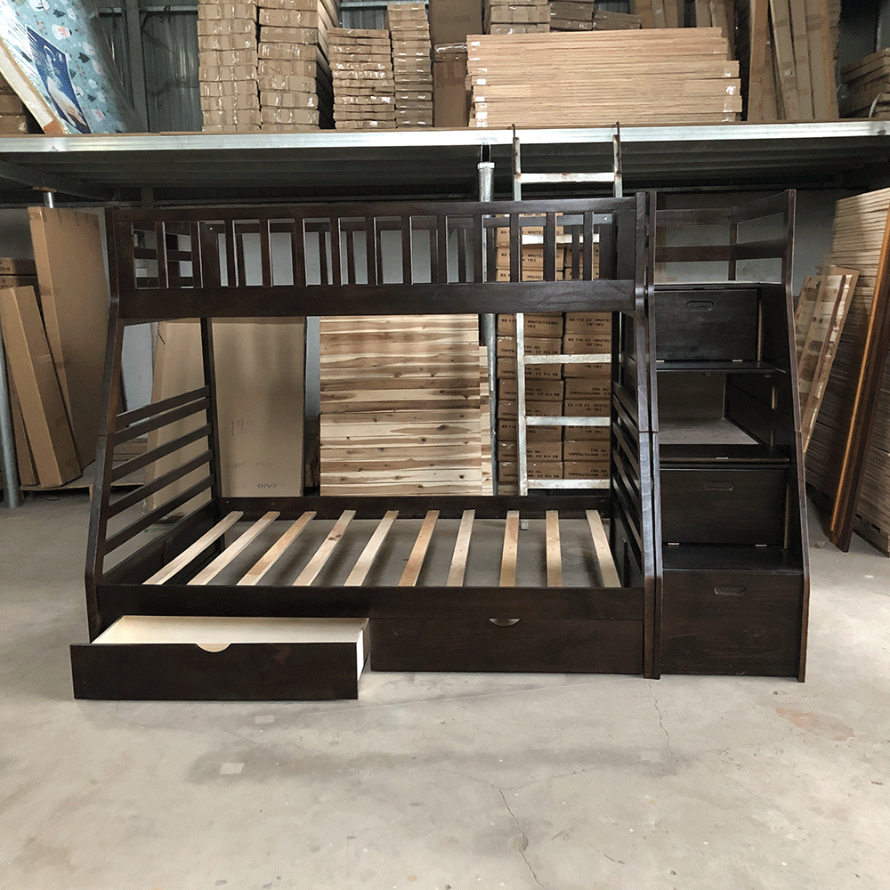Giường tầng xuất khẩu Derby có kích thước lọt lòng giường trên/dưới là 100x193 cm / 120 x 193 cm, phủ bì 206x128x178 cm. Khoảng cách giữa 2 tầng là 98 cm, cầu thang có