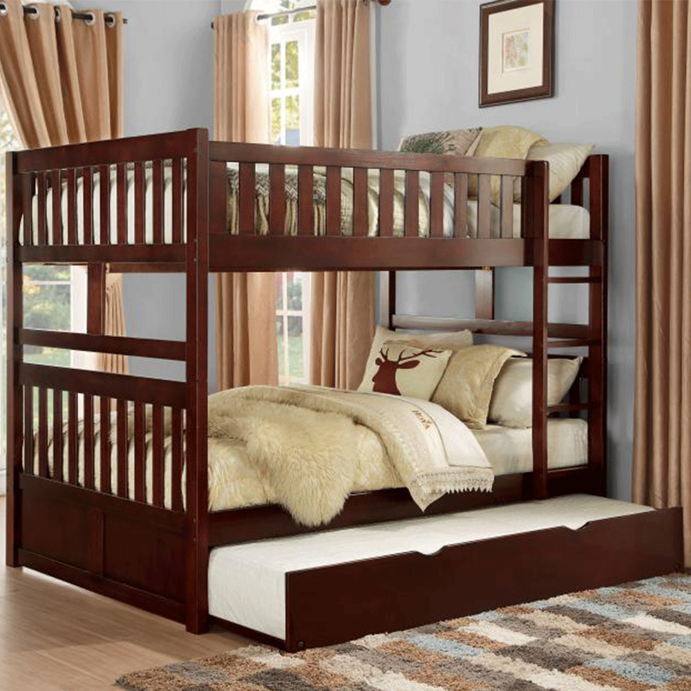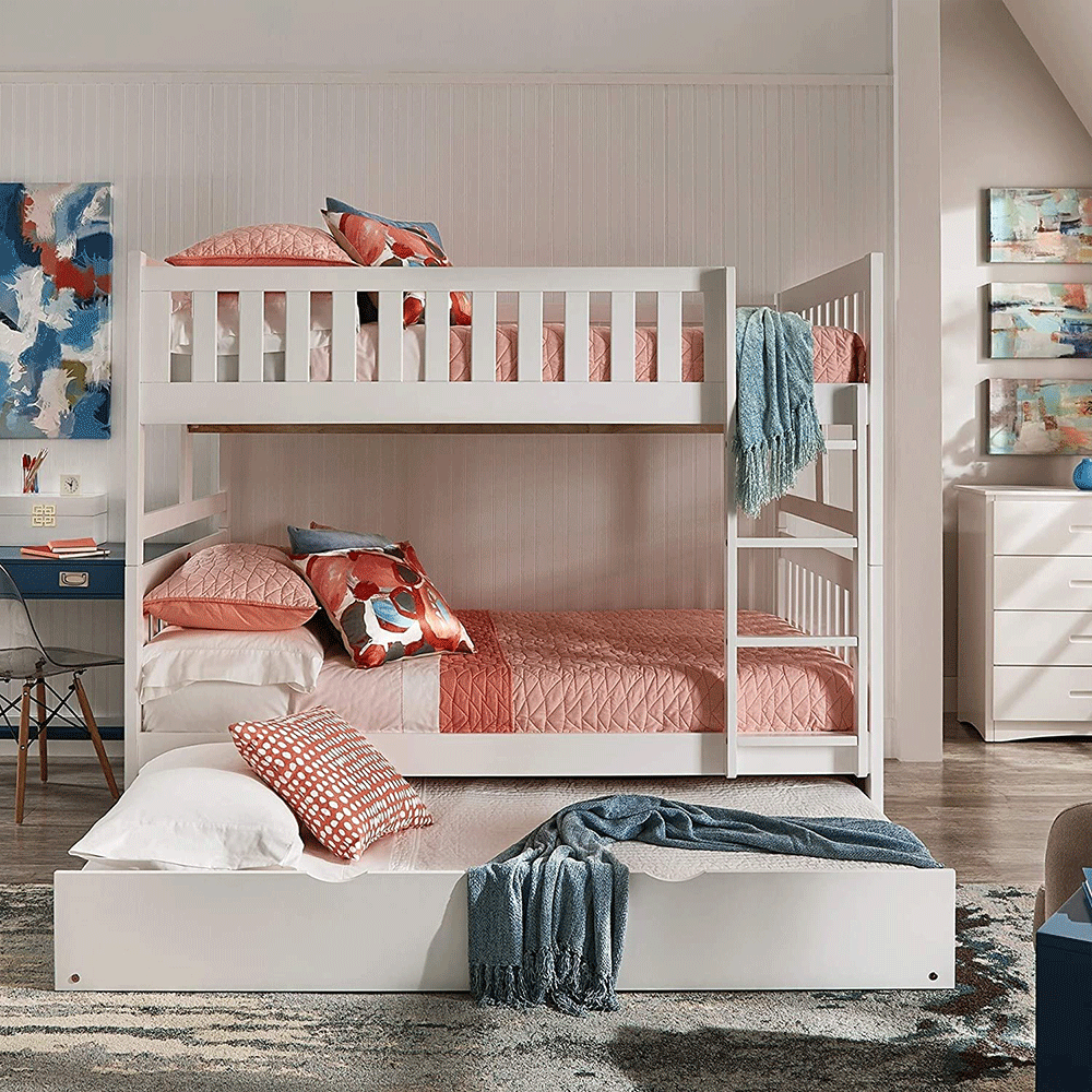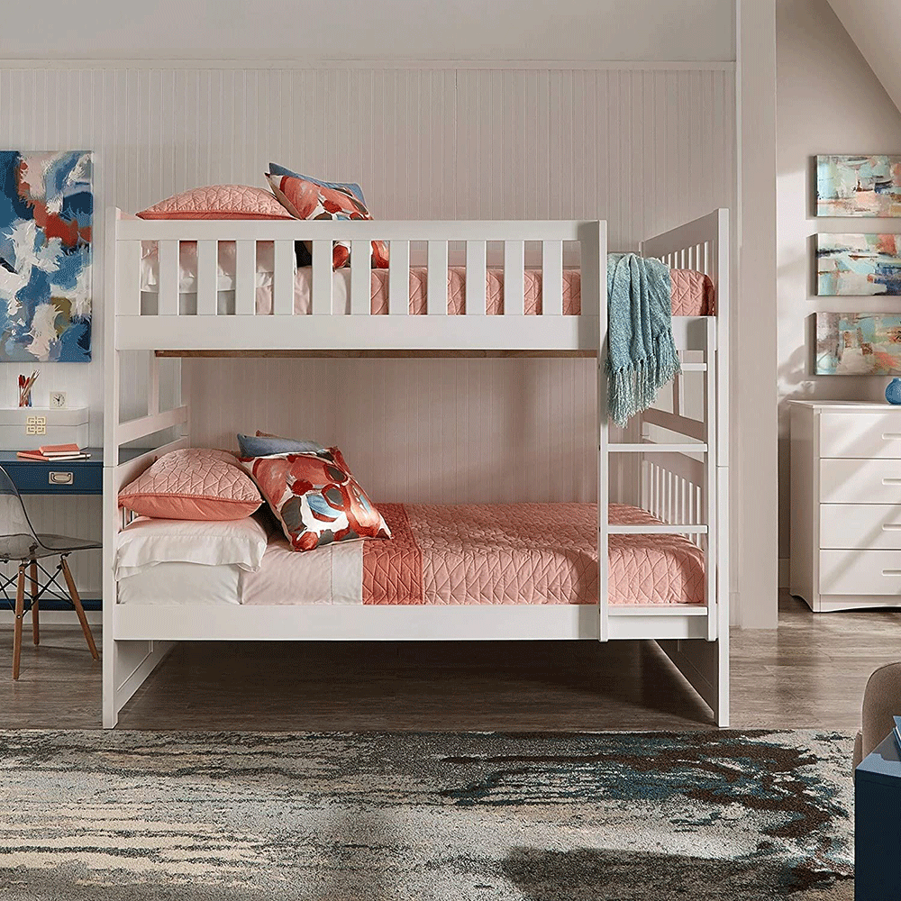 Giường tầng không chỉ giúp tiết kiệm không gian, mà còn là thế giới riêng của các bé. Giường tầng Leeds được thiết kế tối giản với thang liền, 2 tầng có kích thước bằng nhau. Khoảng cách giữa 2 tầng rộng rãi không sợ đụng đầu, kể cả với người lớn. Chất liệu gỗ thông xẻ sấy nhập khẩu được gia công tỉ mỉ, kết cấu chắc chắn, giúp các bé vui chơi an toàn và có những giấc ngủ ngon.
