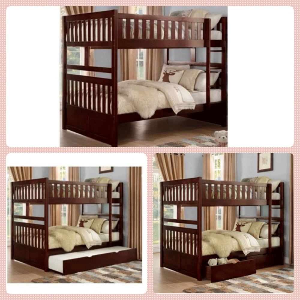+ Chất liệu: Khung giường gỗ thông Newzealand, phân tầng, Vách, đáy hộc gỗ công nghiệp, thang giường MDF chịu lực + Kích thước: kích thước phủ bì, tầng trên ưới 1mx2m Giường tầng hộp