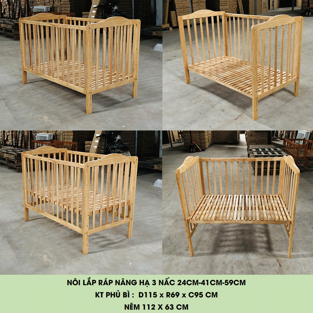 Mua tại TiktokNôi điều chỉnh Elephant được làm từ gỗ thông nhập khẩu với các ưu điểm như vân đẹp, ít mắt, độ cứng cao. Kích thước phủ bì 115x69x95cm, lọt lòng để đặt nệm là 112x63 cm. Đáy nôi có thể điều chỉnh nâng hạ 3 nấc 24-41-59 cm so với mặt đất. Nôi được gia công tỉ mỉ, trau chuốt từng chi tiết, đảm bảo tính thẩm mỹ và sự an toàn cho phụ huynh và trẻ nhỏ. Sản phẩm đóng gói theo tiêu chuẩn xuất khẩu và dễ dàng lắp ráp.