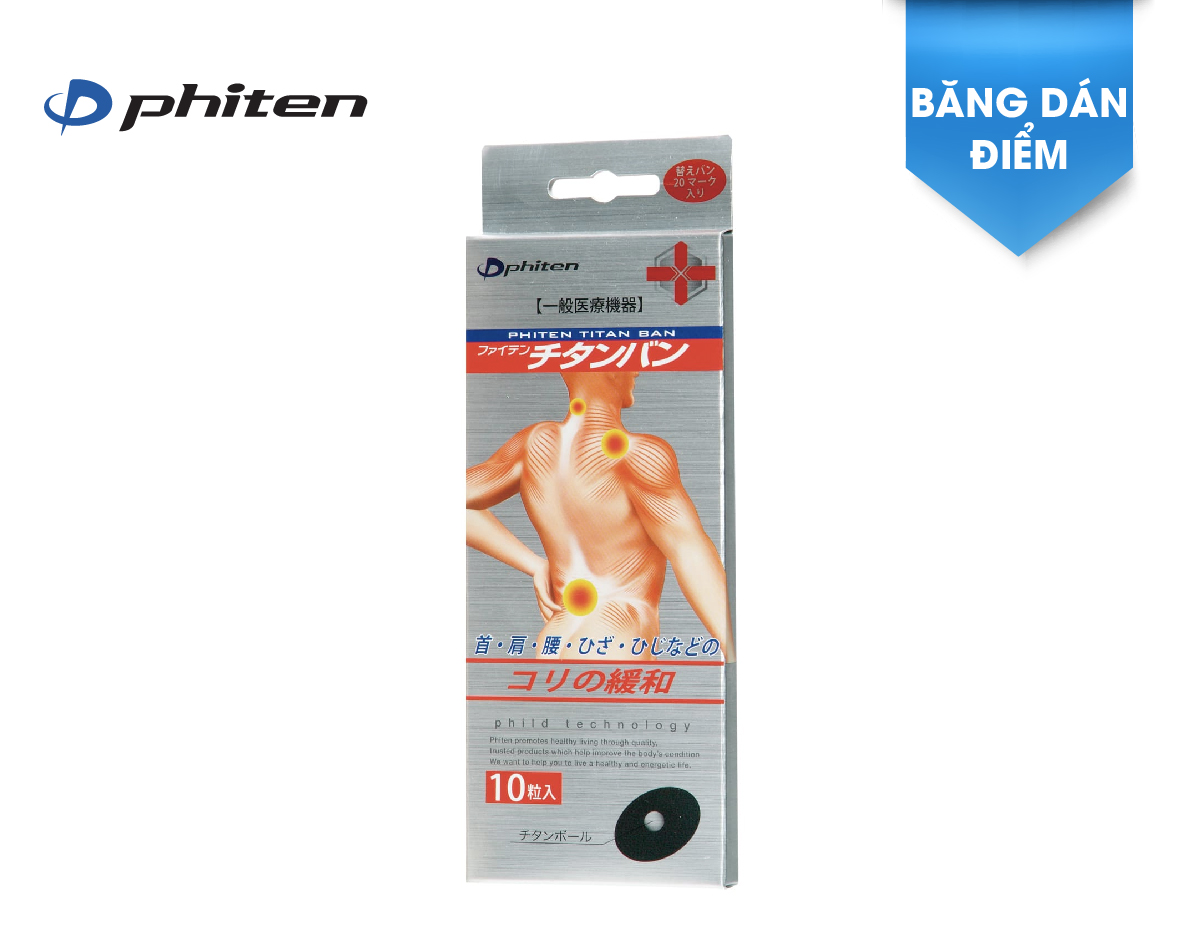 Mua tại TiktokBăng Dán Cơ Phiten Titanium Ban Mô tả: Miếng dán Titanium Ban thực sự rất lý tưởng và phù hợp để kích thích huyệt đạo hoặc hỗ trợ châm cứu. Miếng dán có thể được dán trực tiếp lên khi vực cần kích thích trong khi chơi thể thao. Bi Titanium Ball có thể sử dụng nhiều lần. Tuy nhiên, miếng dán không thể tải sử dụng và vì lý do vệ sinh, miếng dán nên được gỡ ra sau 2 - 3 ngày. Công dụng: Các vùng cổ, vai, hông là những vùng dễ cảm nhận sự đau nhức. Băng dán Phiten Titanban là băng dán có sự vượt trội với viên bi lăn Titanium kèm theo giúp kích thích thả lỏng các cơ và lưu thông máu. Có thể tái sử dụng viên bi Titanium với các miếng băng dán khác Đặc trưng: