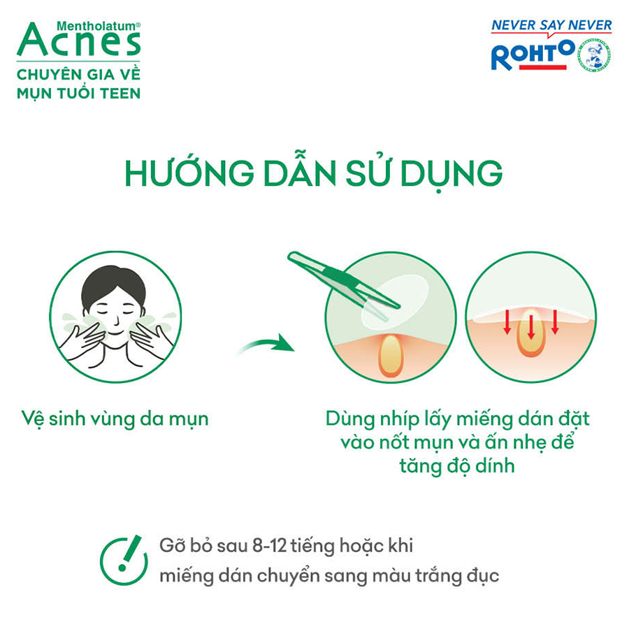 Mua tại TiktokMiếng dán mụn giúp giảm mụn sưng viêm Acnes Clear Patch mang lại 3 tác động nổi bật: GIẢM MỤN – BẢO VỆ – CHE PHỦ. Với độ dày chỉ 0,2 mm, miếng dán mụn giúp che phủ tự nhiên, đặc biệt là khi trang điểm cùng với khả năng chống thấm nước và mồ hôi vượt trội. Ngoài ra, chiết xuất nho (Grape Seed Extract) có trong miếng dán mụn giúp ngăn ngừa sẹo thâm sau mụn hiệu quả.