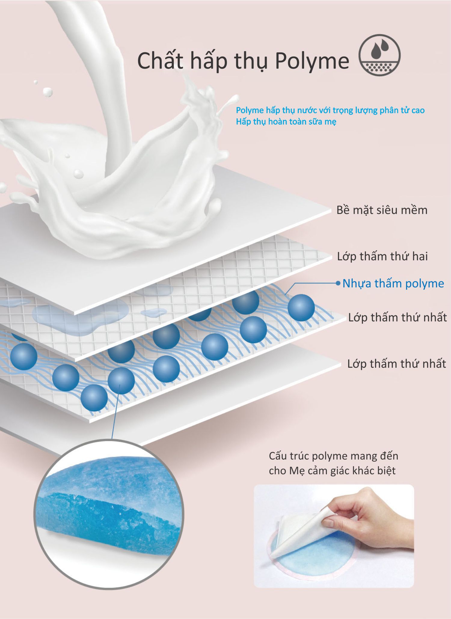 - Thấm hút tức thì lên đến 150ml sữa và chống thấm ngược trở lại; - Siêu mỏng chỉ 0,07cm, liền mạch, ôm sát ; - Co giãn 3 chiều, dễ điều chỉnh để vừa