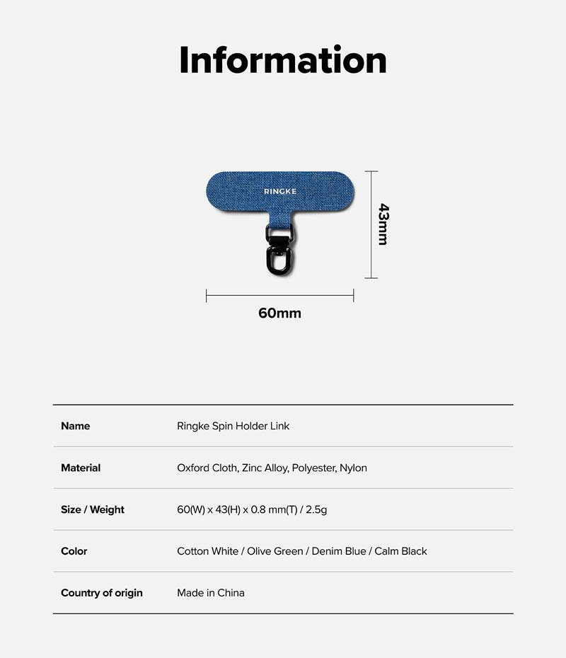 Miếng Spin Holder Link nhiều màu (dùng cho Holder Link Strap) Miếng Spin Holder Link nhiều màu có chất liệu vải sợi Oxford, nhiều màu sắc trẻ trung, cá tính và có kèm đầu kim loại xoay tròn 360 độ. Bạn có thể phối cùng tông màu với các sợi dây để tạo bộ sưu mix & match theo phong cách của bạn. Sản phẩm được dùng cùng với các loại dây đeo Ringke Straps. Đầu kim loại xoay tròn 360 độ giúp sử dụng dễ dàng hơn mà không lo dây đeo bị rối. Đặc biệt, bạn có thể sử dụng cùng các ốp lưng không có lỗ xỏ dây đeo. Hướng dẫn sử dụng Bước 1: Nhét miếng Holder Link vào phía trong ốp lưng, đầu khoen móc xỏ qua lỗ cắm sạc của ốp lưng như hình hướng dẫn bên dưới. Bước 2: Xỏ dây vào khoen móc của Holder Link. (Lưu ý: dây đeo được bán riêng) Thông số kỹ thuật Tên sản phẩm: Ringke Spin Holder Link Chất liệu: vải sợi Oxford, Polyester, Nylon, móc kim loại Kích thước: 60 x 43 x 0.8 mm Trọng lượng: 2.5 gram Thương hiệu: RINGKE – Xuất xứ: Trung Quốc Màu sắc có thể tuỳ chọn: DENIM BLUE, COTTON WHITE, CALM BLACK, OLIVE GREEN. Các lưu ý về sản phẩm