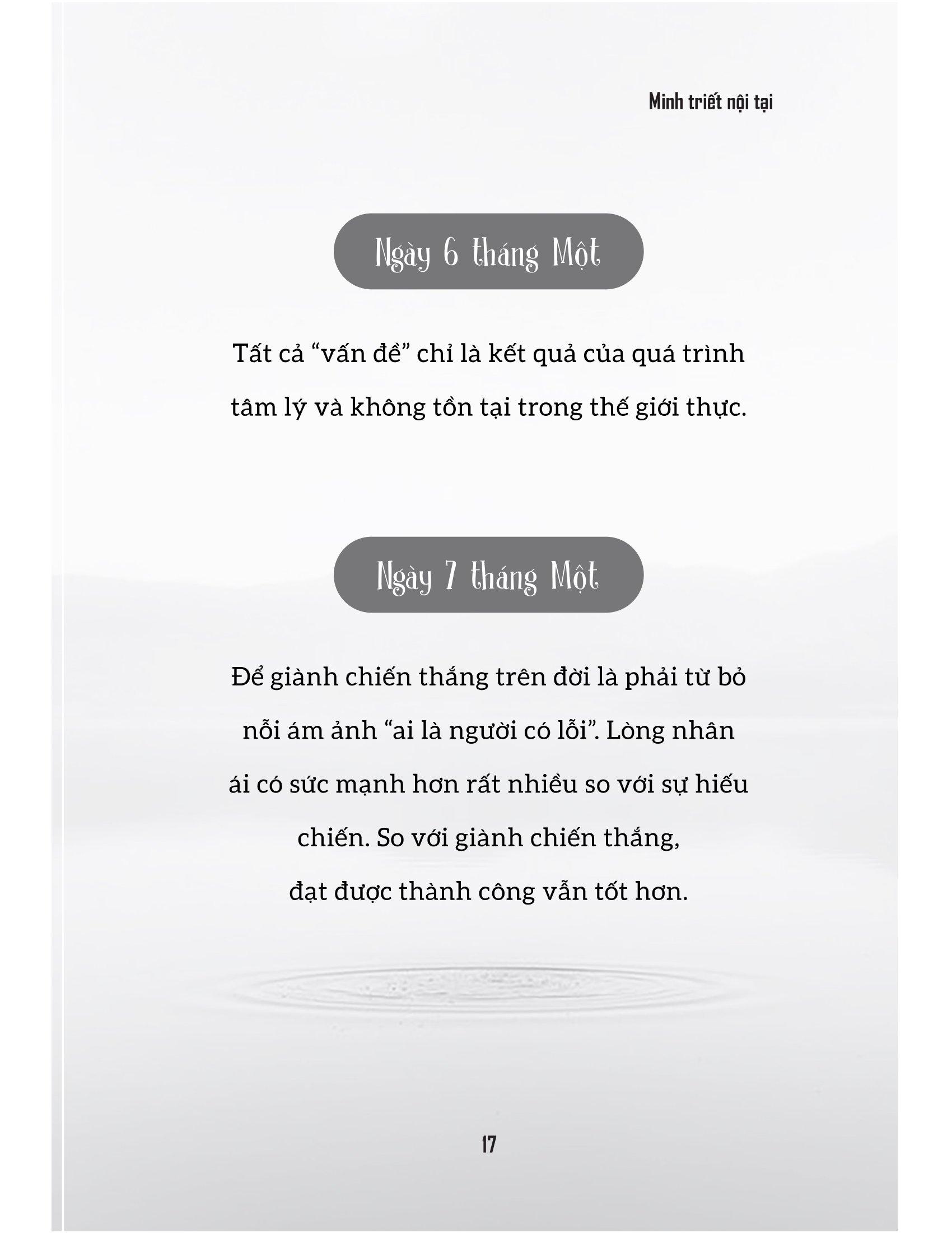“Minh Triết Nội Tại” không trả lời những câu hỏi ấy. Cuốn sách không đóng vai trò như cẩm nang giải đáp mọi bí ẩn trong vũ trụ, mà là cuốn nhật ký hàng ngày, mang những thông điệp chân lý được tìm thấy trong các giới luật của tôn giáo phương Tây với cốt lõi của triết học phương Đông, bắc cầu nối giữa thế giới vật chất, quen thuộc với lĩnh vực tâm linh, phi tuyến tính. Những lời nhắn trong sách được tuyển chọn cẩn thận, mang đến cho độc giả một suy ngẫm mới mỗi ngày. Bất kỳ đoạn nào trong số này, nếu được hiểu đầy đủ, đều có thể nâng cao mức độ tỉnh thức của một người.