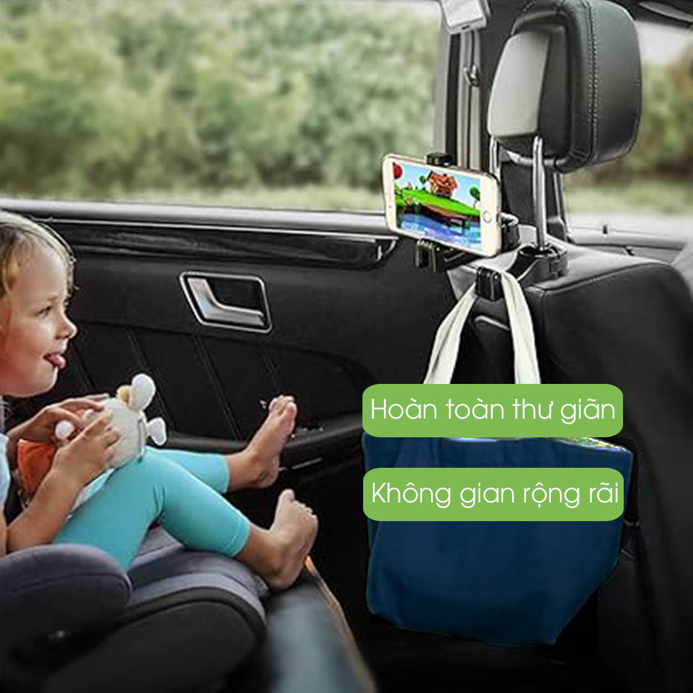 - Thiết kế đa năng vừa treo đồ, vừa làm kẹp điện thoại để băng ghế sau thoải mái sử dụng thiết bị - Móc xoay 360 độ tiện lợi ra phía trước hoặc phía