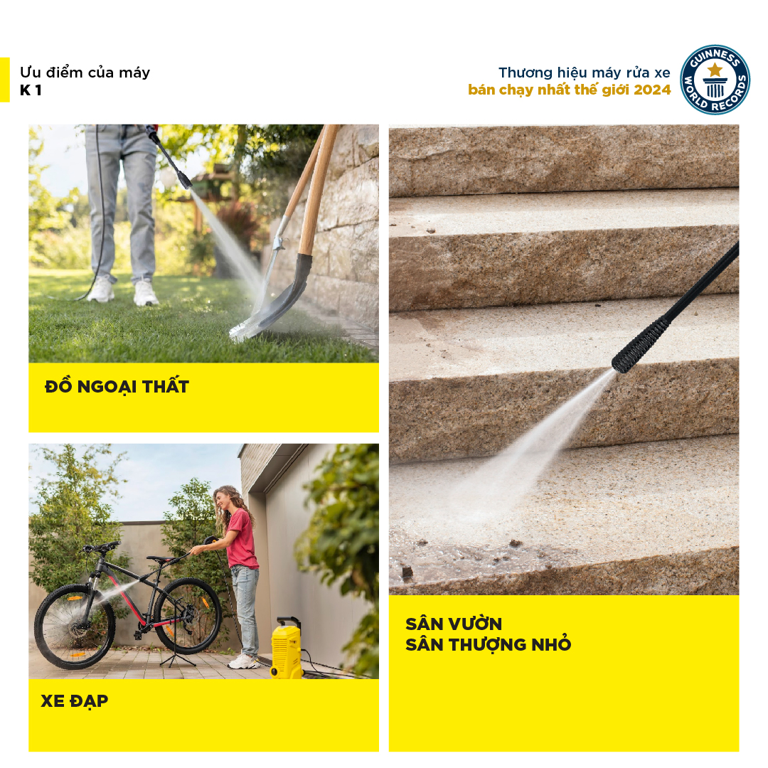 - Máy phun rửa áp lực cao K 1 là một dòng máy xịt rửa cao áp được chạy với động cơ chổi than, với áp lực lớn đến 90 bar, hỗ trợ làm sạch các vết bẩn thông thường trên xe máy, ban công, sân thượng nhỏ