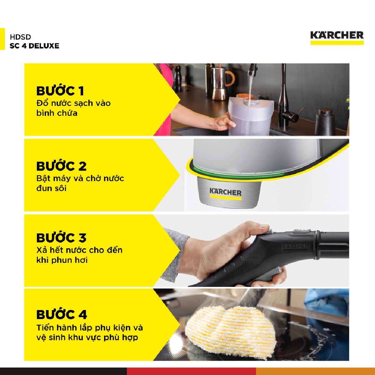 Máy làm sạch bằng hơi nước SC 4 Deluxe làm sạch mạnh mẽ ở áp suất 4,0 bar, Bình chứa nước có thể tháo rời và châm thêm nước liên tục, đảm bảo làm sạch không gián đoạn. Máy có ngăn chứa phụ kiện lớn, đèn LED báo trạng thái hoạt động, đầu phun sàn EasyFix với khớp nối linh hoạt và công nghệ lamella, cùng nhiều phụ kiện khác để làm sạch hiệu quả nhiều loại bề mặt.