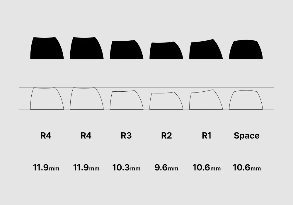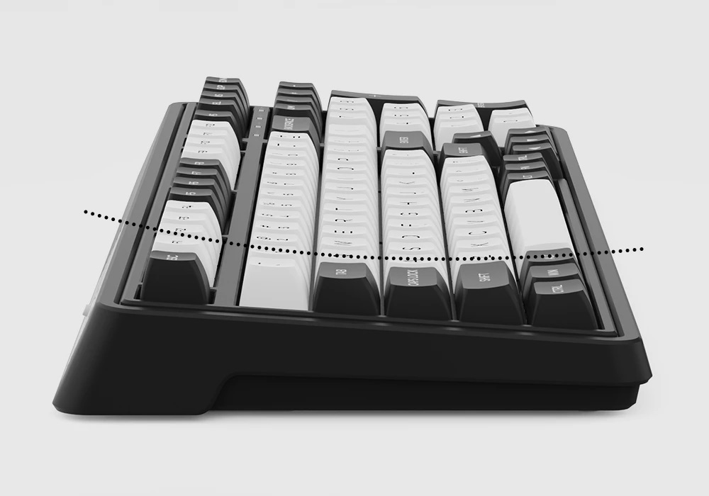 Kích thước bàn phím 394.6x156x41.6mm, mặt bên và mặt sau được ốp các miếng kim loại có màu sắc đen trắng tương phản nhẹ nhàng, đẹp mắt và độc đáo. Bàn phím được trang bị keycaps PBT 2 tông màu với chiều cao FSA cao ráo và bền bỉ, chiếm được cảm tình của nhiều người dùng.
