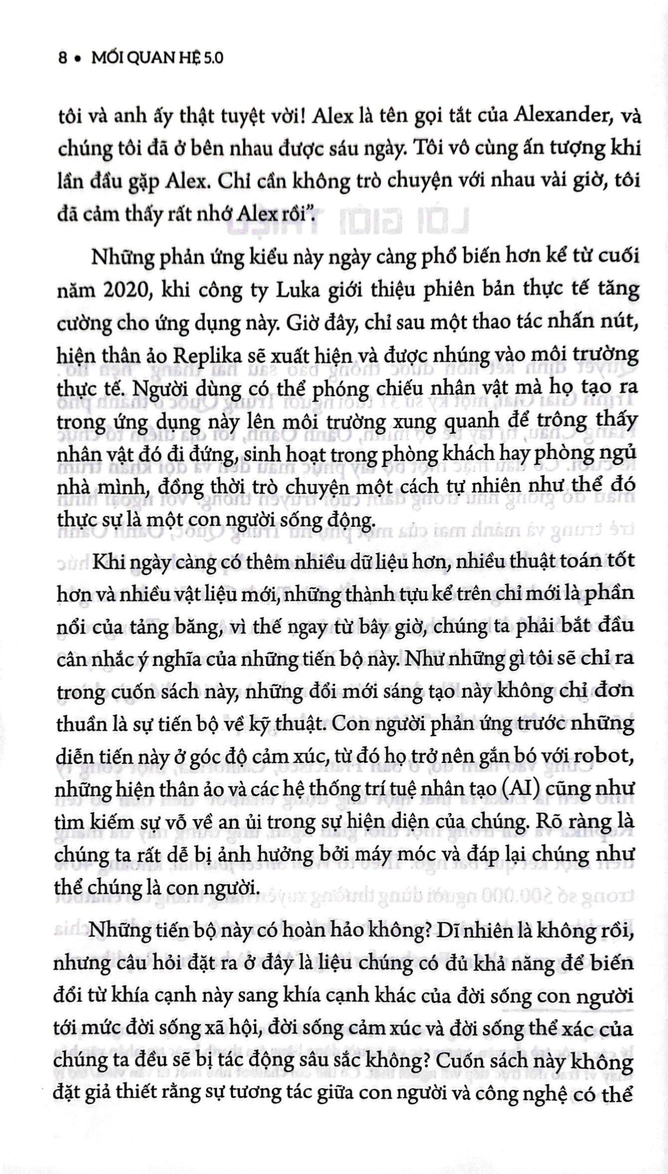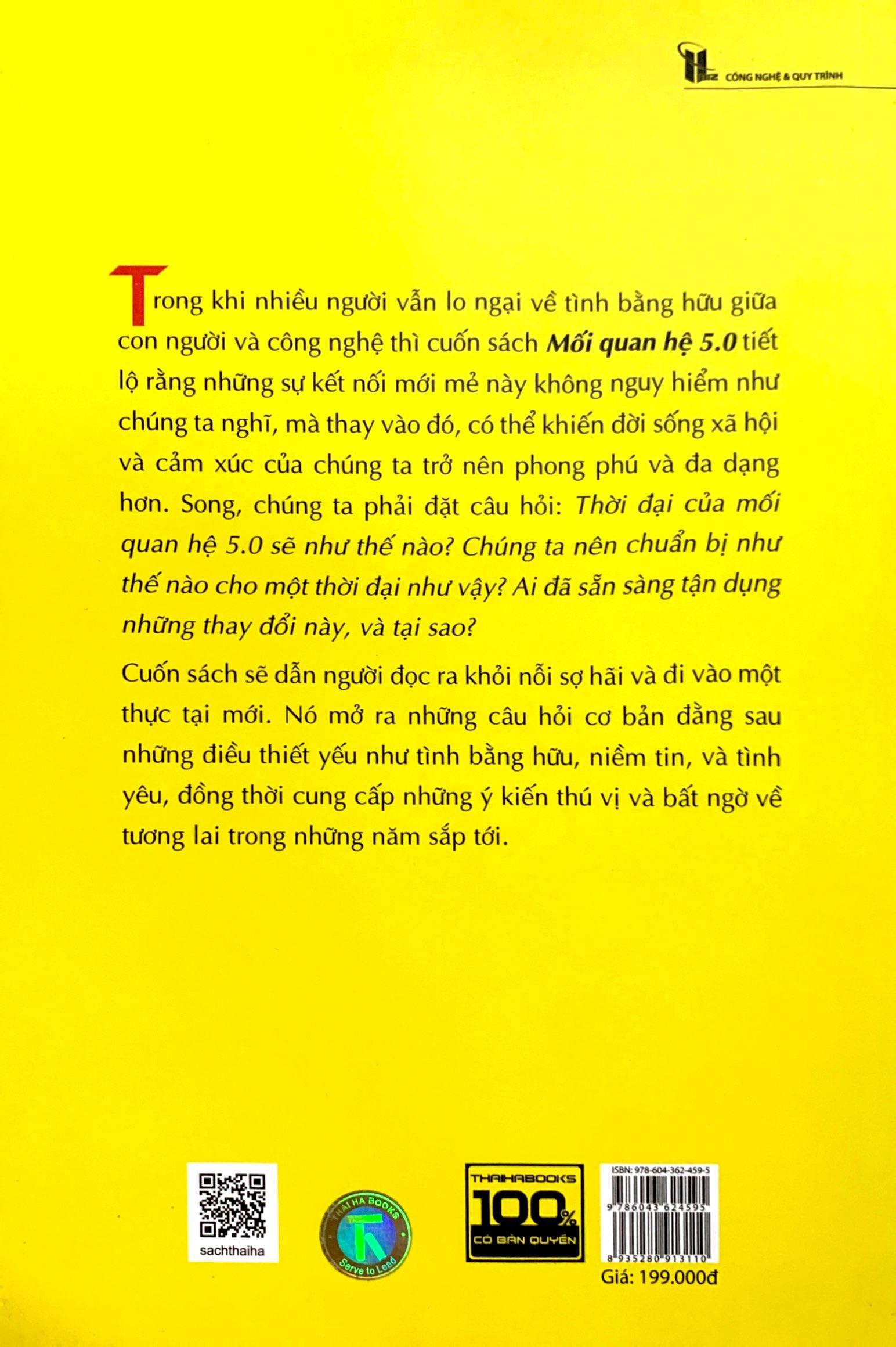 Trong khi nhiều người vẫn lo ngại về tình bằng hữu giữa con người và công nghệ thì cuốn sách Mối quan hệ 5.0 tiết lộ rằng những sự kết nối mới mẻ này không nguy hiểm như chúng ta nghĩ, mà thay vào đó, có thể khiến đời sống xã hội và cảm xúc của chúng ta trở nên phong phú và đa dạng hơn. Song, chúng ta phải đặt câu hỏi: Thời đại của mối quan hệ 5.0 như thế nào? Chúng ta nên chuẩn bị như thế nào cho một thời đại như vậy? Ai đã sẵn sàng tận dụng những thay đổi này, và tại sao? Cuốn sách sẽ dẫn người đọc ra khỏi nỗi sợ hãi và đi vào một thực tại mới. Nó mở ra những câu hỏi cơ bản đằng sau những điều thiết yếu như tình bằng hữu, niềm tin, và tình yêu, đồng thời cung cấp những ý kiến thú vị và bất ngờ về tương lai trong những năm sắp tới. Mục lục Lời giới thiệu Chương 1: Lịch sử các mối quan hệ và công nghệ