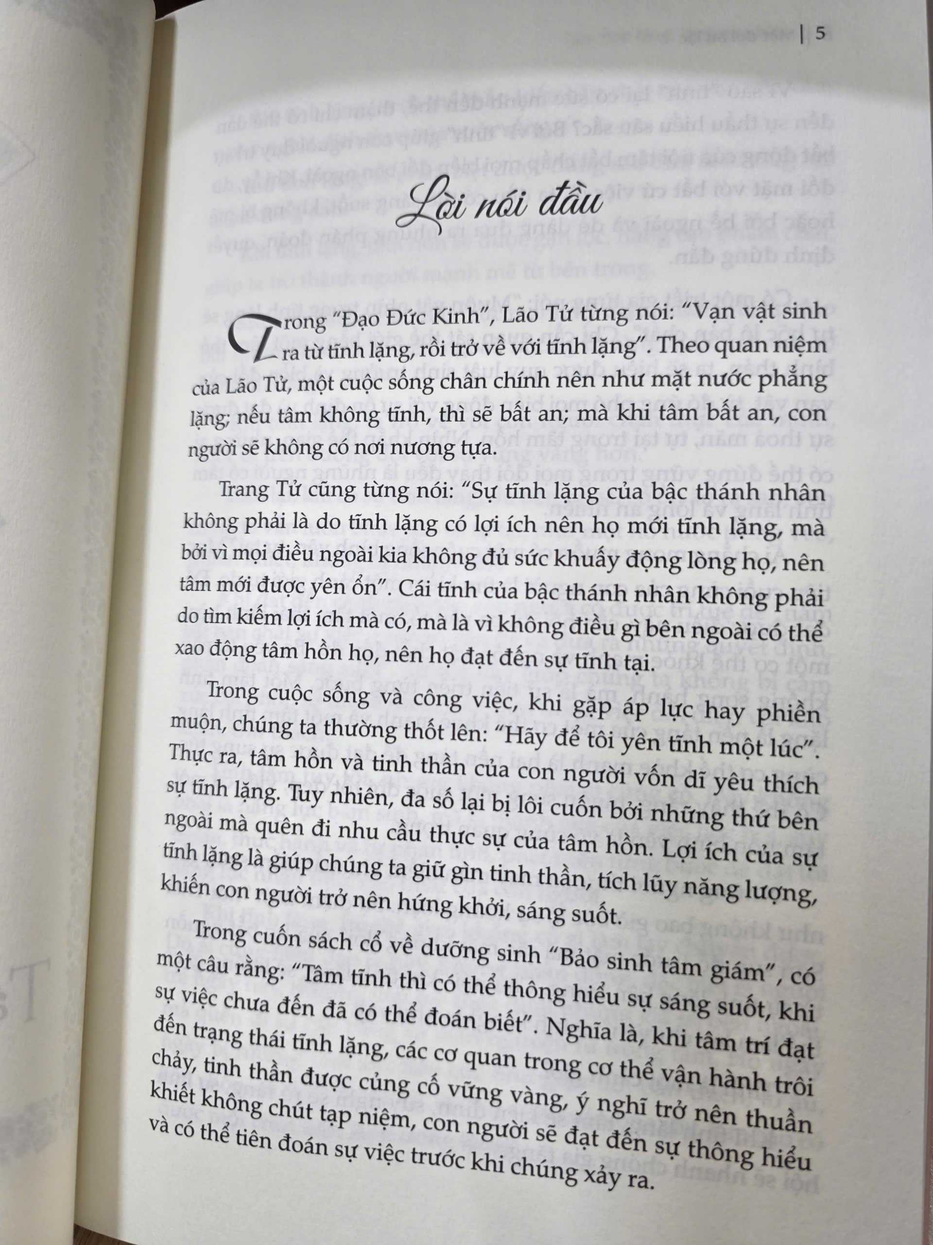 Ai chẳng mong muốn có một cuộc sống bình yên, tự tại? Mục tiêu cuối cùng của con người là tìm kiếm một cảnh giới tự do. Để đạt được điều này, cần hội tụ đủ ba yếu tố: một tâm thái bình hòa, một cơ thể khỏe mạnh và nguồn vật chất đầy đủ. Ba yếu tố này không song hành, mà là sự tiến triển từng bước. Một tâm tĩnh lặng là nền tảng của một cơ thể khỏe mạnh và một tâm tĩnh lặng cùng cơ thể khỏe mạnh là hai nền tảng để đạt được sự sung túc. Người có tâm tĩnh lặng sẽ không sinh ra phân biệt, không sinh phiền não, không sinh chấp trước, càng không bị đảo lộn hay rối loạn. Trước một người biết tĩnh tâm, cuộc sống chưa bao giờ lộn xộn và thế giới cũng chẳng bao giờ ồn ào...