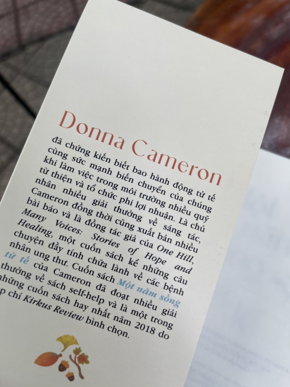 Donna Cameron đã chứng kiến biết bao hành động tử tế cùng sức mạnh biến chuyển của chúng khi làm việc trong môi trường nhiều quỹ từ thiện và tổ chức phi lợi nhuận. Là chủ nhân nhiều giải thưởng về sáng tác, Cameron đồng thời cũng xuất bản nhiều bài báo và là đồng tác giả của One Hill, Many Voices: Stories of Hope and Healing, một cuốn sách kể những câu chuyện đầy tính chữa lành về các bệnh nhân ung thư. Cuốn sách Một năm sống tử tế của Cameron đã đoạt nhiều giải thưởng về sách self-help và là một trong những cuốn sách hay nhất năm 2018 do tạp chí Kirkus Review bình chọn.