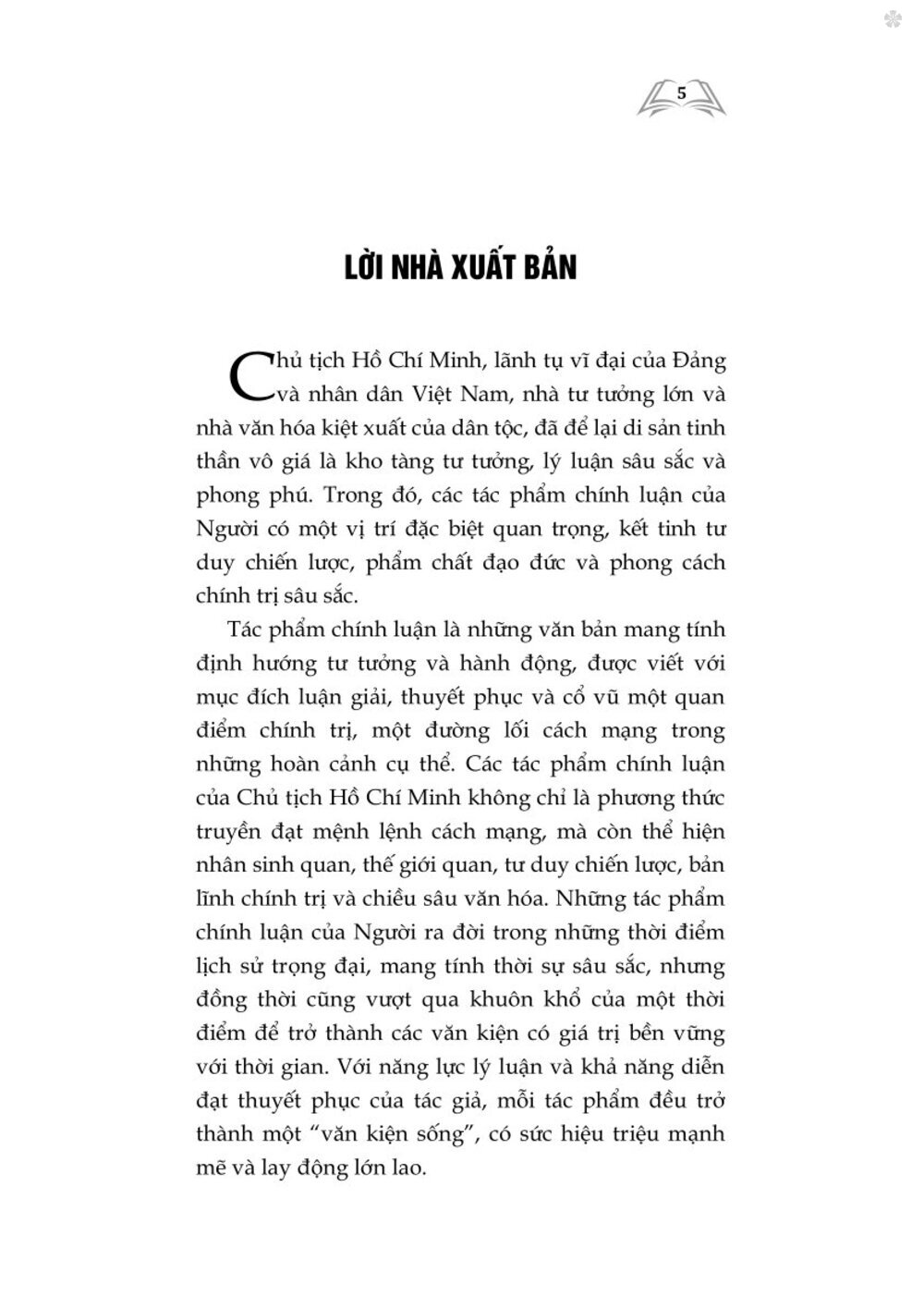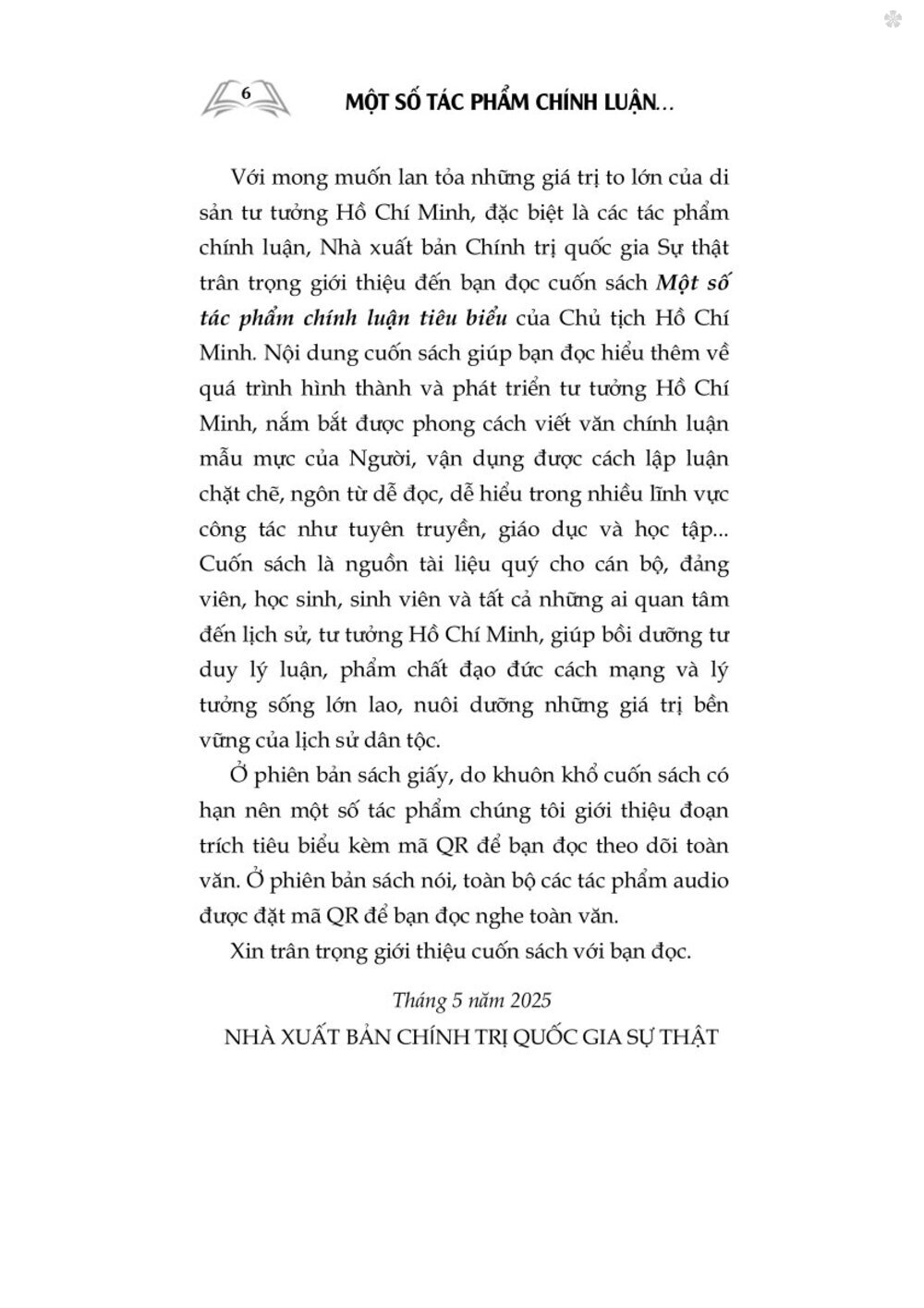 Với mong muốn lan tỏa những giá trị to lớn của di sản tư tưởng Hồ Chí Minh, đặc biệt là các tác phẩm chính luận, Nhà xuất bản Chính trị quốc gia Sự thật trân trọng giới thiệu đến bạn đọc cuốn sách Một số tác phẩm chính luận tiêu biểu của Chủ tịch Hồ Chí Minh. Nội dung cuốn sách giúp bạn đọc hiểu thêm về quá trình hình thành và phát triển tư tưởng Hồ Chí Minh, nắm bắt được phong cách viết văn chính luận mẫu mực của Người, vận dụng được cách lập luận chặt chẽ, ngôn từ dễ đọc, dễ hiểu trong nhiều lĩnh vực công tác như tuyên truyền, giáo dục và học tập...  Cuốn sách là nguồn tài liệu quý cho cán bộ, đảng viên, học sinh, sinh viên và tất cả những ai quan tâm đến lịch sử, tư tưởng Hồ Chí Minh, giúp bồi dưỡng tư duy lý luận, phẩm chất đạo đức cách mạng và lý tưởng sống lớn lao, nuôi dưỡng những giá trị bền vững của lịch sử dân tộc.  Ở phiên bản sách giấy, do khuôn khổ cuốn sách có hạn nên một số tác phẩm chúng tôi giới thiệu đoạn trích tiêu biểu kèm mã QR để bạn đọc theo dõi toàn văn. Ở phiên bản sách nói, toàn bộ các tác phẩm audio được đặt mã QR để bạn đọc nghe toàn văn. Xin trân trọng giới thiệu cuốn sách với bạn đọc