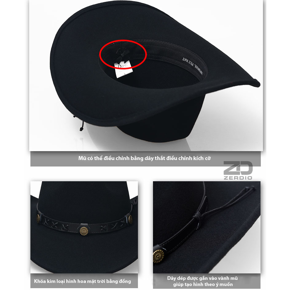 - Xuất xứ: Thương hiệu nội địa Quảng Châu Ảnh chi tiết mũ cao bồi miền tây MP055 tại cửa hàng ZERDIO: Đặc điểm nổi bật của sản phẩm