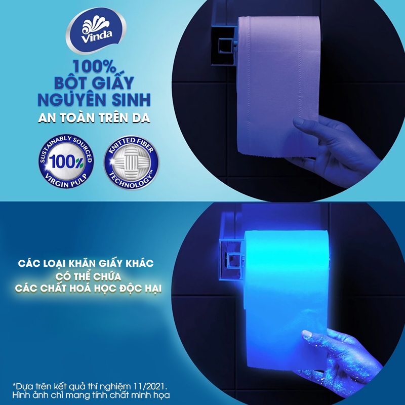 Giấy vệ sinh cao cấp Vinda Deluxe được sản xuất từ 100% bột giấy nguyên sinh, không hóa chất tẩy độc hại, an toàn cho cả làn da nhạy cảm. Giấy vệ sinh có kết cấu bền dai ngay cả khi ướt, không để lại vụn giấy khi sử dụng, giúp bạn luôn cảm thấy dễ chịu và sạch sẽ sau mỗi lần dùng.