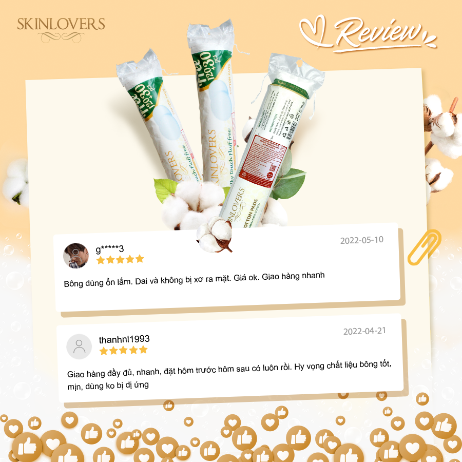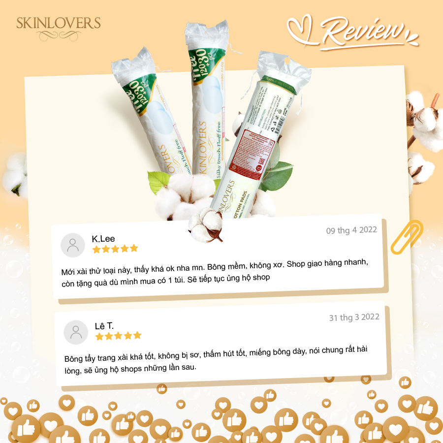 - Kết hợp với lotion để làm mặt nạ. Thành phần: 100% cotton Hướng dẫn sử dụng: Sử dụng trực tiếp lên da. Dùng với các dung dịch như nước tẩy trang, toner trong các bước dưỡng da hàng ngày. Hãy thoa nhẹ nhàng, chú ý không miết mạnh và chà xát miếng bông, tránh gây tổn thương da và làm rách miếng bông. Đối tượng sử dụng: Sản phẩm dùng được cho mọi loại da. Bảo quản: Bảo quản nơi khô ráo, thoáng mát và tránh xa tầm tay trẻ em. Xuất xứ: Skinlovers- Thổ Nhĩ Kỳ HSD: 5 năm kể từ ngày sản xuất, ngày sản xuất in trên sản phẩm