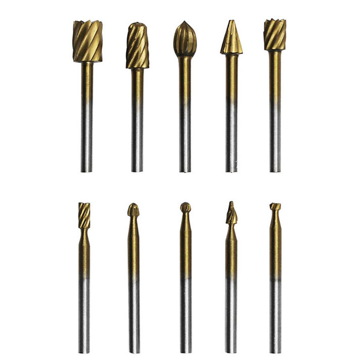 - Làm tròn và xử lý rãnh của các bộ phận cơ khí khác nhau, làm sạch đường ống, hoàn thiện bề mặt lỗ bên trong của các bộ phận cơ khí ƯU ĐIỂM Mũi mài khắc mạ titanium siêu cứng 10 mũi mài gỗ phụ kiện máy khoan mài mini