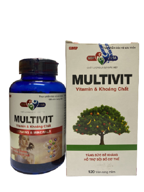 Vitamin đóng vai trò quan trọng, giúp duy trì các chức năng sống của cơ thể một cách ổn định và hiệu quả. Cơ thể không thể tự tổng hợp vitamin, chính vì vậy phải tăng cường bổ sung từ bên ngoài bằng cách cải thiện chất lượng bữa ăn và sử dụng thêm viên uống vitamin có trong Multivit. Thành phần Multivit Softgels Mỗi viên nang mềm chứa: Calci Carbonate ……………………………………………. 80 mg Vitamin C …………………………………………………… 50 mg Sắt (II) Fumarat …………………………………………… 30 mg Vitamin PP ………………………………………………… 7 mg Vitamin B6 ………………………………………………… 1.5 mg Vitamin B1 ………………………………………………… 1.5 mg Vitamin E …………………………………………………… 1 mg Axit Folic ………………………………………………… 200 mcg Vitamin B12 ………………………………………………… 2 mcg Công dụng Multivit Softgels Giúp bổ sung nhu cầu Vitamin và khoáng chất cần thiết cho cơ thể, hỗ trợ bồi bổ cơ thể, tăng sức đề kháng, cải thiện hệ thống tiêu hóa, giúp cơ thể khỏe mạnh. Giúp bổ sung nhu cầu Vitamin và khoáng chất cần thiết cho phụ nữ có kế hoạch mang thai, phụ nữ mang thai (Multivit cho bà bầu) phụ nữ đang cho con bú, giúp giảm triệu chứng buồn nôn, nôn khi thai nghén. Giảm thiểu và ngăn ngừa các nguy cơ như loãng xương, thiếu máu, rối loạn hệ thần kinh, và hệ miễn dịch kém do thiếu hụt khoáng chất. Giảm các tình trạng căng thẳng quá độ (stress), lo âu làm việc trí óc. Đối tượng sử dụng Multivit Softgels Phụ nữ có thai và cho con bú. Người có nhu cầu bổ sung vitamin và khoáng chất do chế độ ăn thiếu hụt. Trẻ em đang trong độ tuổi phát triển, người già yếu, người mới ốm dậy cần phục hồi sức khỏe. Thời hạn sử dụng 36 tháng kể từ ngày sản xuất. Hạn sử dụng được ghi cụ thể ở mỗi hộp. Cách đóng gói và bảo quản Hộp 120 viên nang mềm Bảo quản nơi khô ráo, thoáng mát. Tránh xa tầm tay trẻ em. Lưu ý: Thực phẩm này không phải là thuốc và không có tác dụng thay thế thuốc chữa bệnh. Không dùng cho người mẫn cảm với bất kỳ thành phần nào của sản phẩm.