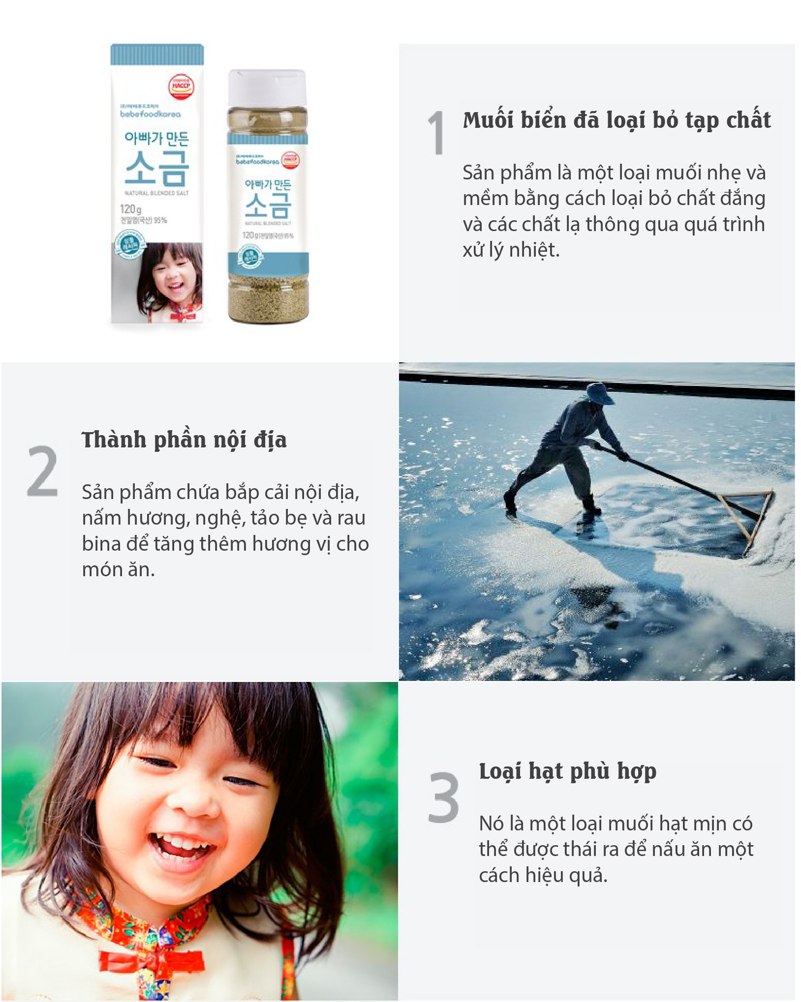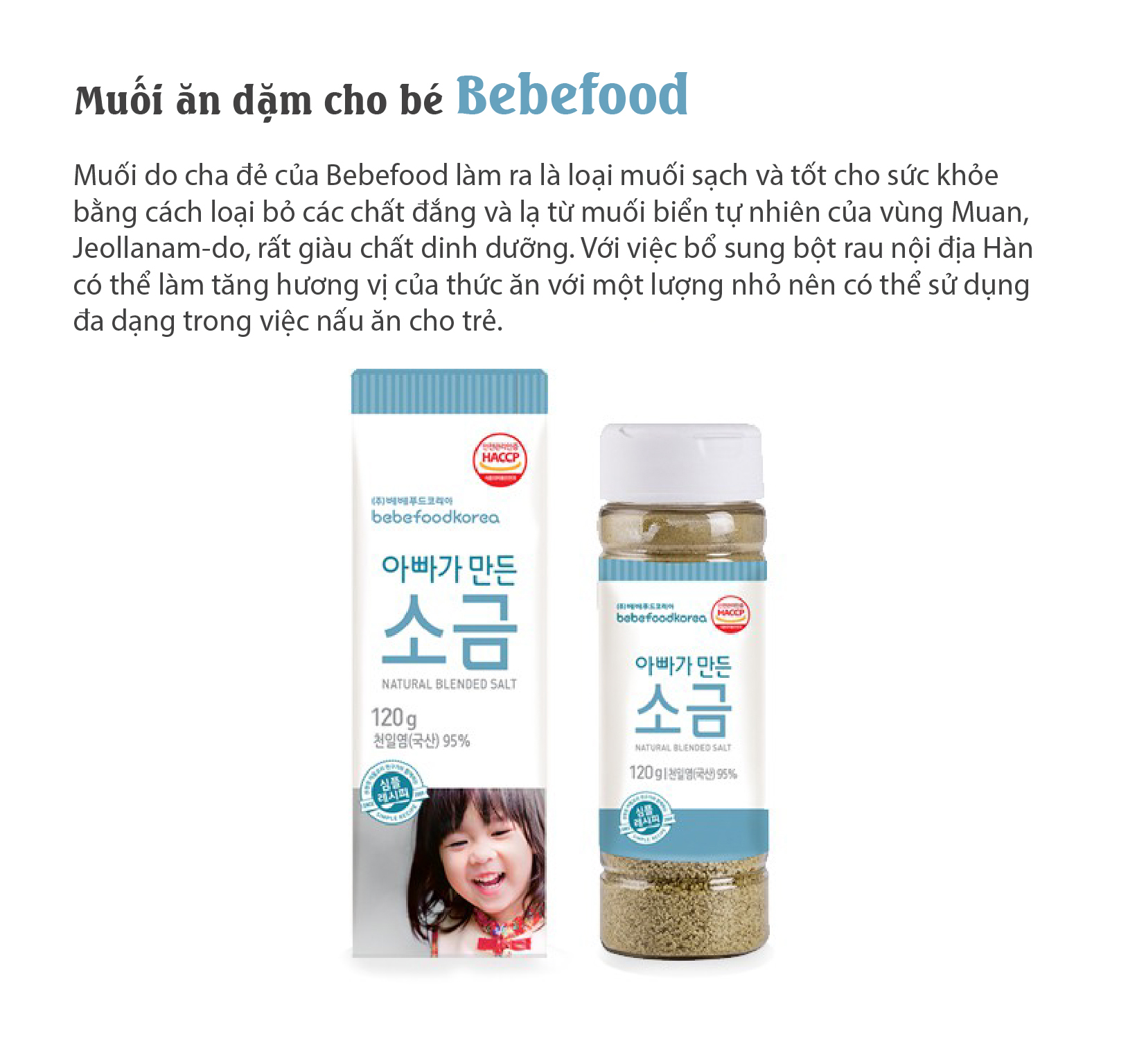 Muối ăn dặm cho bé Bebefood Hàn Quốc Muối do cha đẻ của Bebefood làm ra là loại muối sạch và tốt cho sức khỏe bằng cách loại bỏ các chất đắng và lạ từ