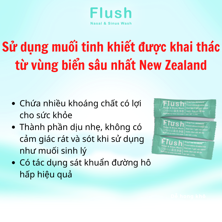 - Muối sinh lý rửa mũi Flush là loại muối được khai thác từ vùng biển sâu nhất của NewZealand