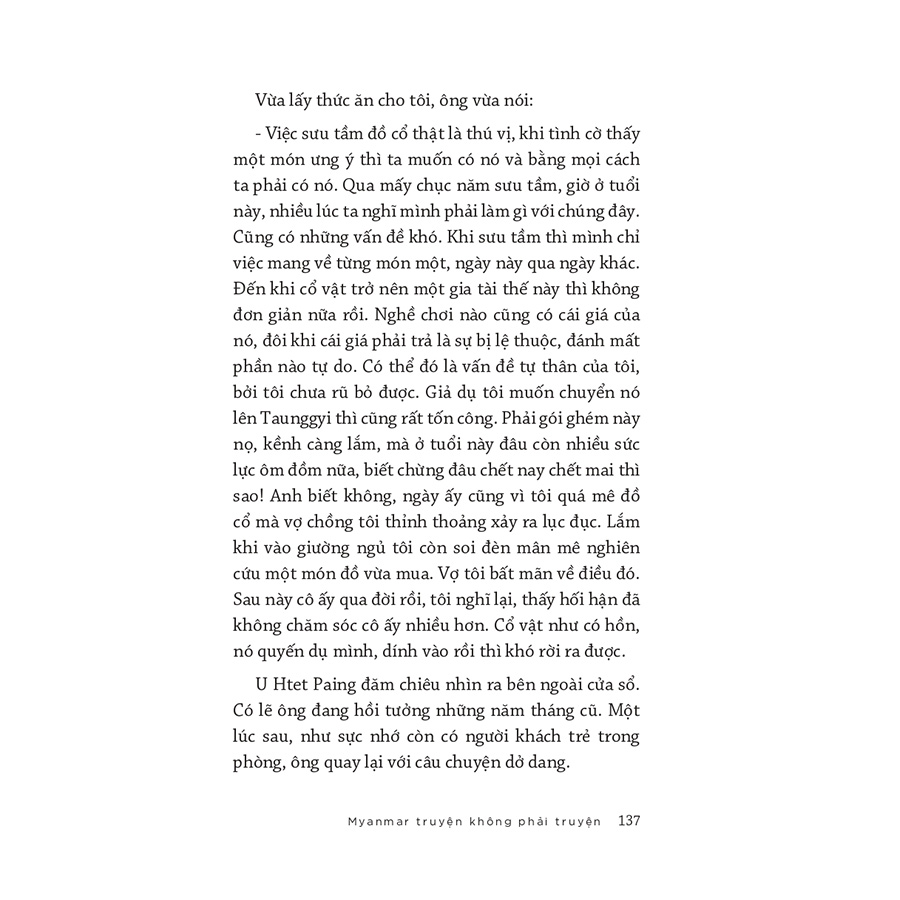 “Myanmar truyện không phải truyện” lấy bối cảnh thời kỳ có nhiều biến động của đất nước Myanmar: cuộc đảo chính của giới cầm quyền quân sự cũng là thời điểm đại dịch Corona hoành hành khủng khiếp. Nhưng kỳ diệu thay, ta không thấy tác giả mô tả cảnh chiến tranh, biểu tình phản kháng của các phe phái dẫn đến đổ máu hay cảnh chết chóc bi thương, mà ngược lại, toàn bộ tác phẩm toát lên tình yêu bình dị đầy thơ mộng nơi thị trấn K, một thị trấn nhỏ thuộc bang Shan, phía đông bắc đất nước này, nơi tác giả đã sống, đã yêu, đã hoà nhập với những người bản địa chất phác.