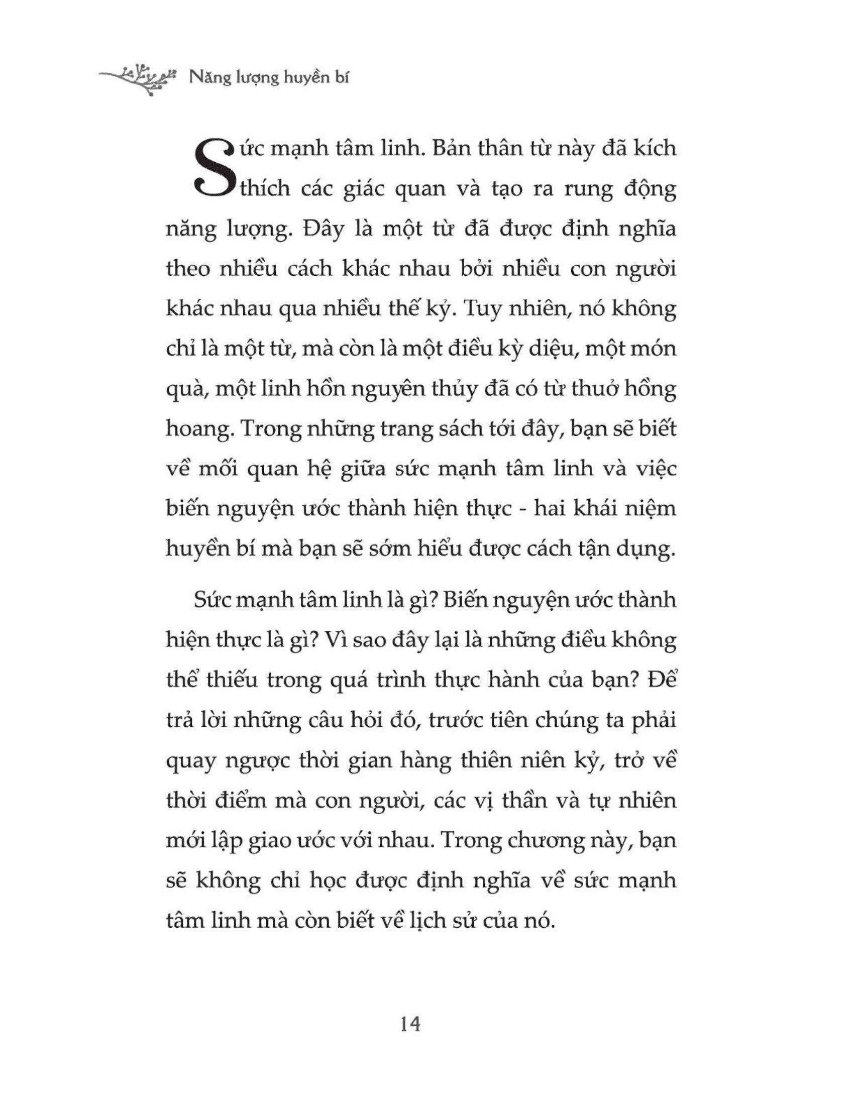 Năng Lượng Huyền Bí Những điều thần kỳ tồn tại ngay trong bản thân mỗi chúng ta và môi trường xung quanh ta. Vạn vật đều chứa trong m.ình năng lượng và phép màu, từ những bông hoa đến những viên đá nhỏ bé. Cuốn sách Năng lượng huyền bí hướng dẫn chúng ta thấu hiểu, kết nối và tận dụng những nguồn sức mạnh cổ xưa để hiện thực hóa những ước muốn và mục tiêu của m.ình. Khi những nỗ lực bền bỉ và nghiêm túc đi kèm với sự trợ sức của các nguyên tố tự nhiên và các thiên thể, cuộc sống của ta sẽ không chỉ ngày càng thêm trọn vẹn và cân bằng, mà còn nhận được sự bảo hộ và phước lành từ những vị thần và linh hồn linh thiêng. Với Năng lượng huyền bí, bạn có thể: