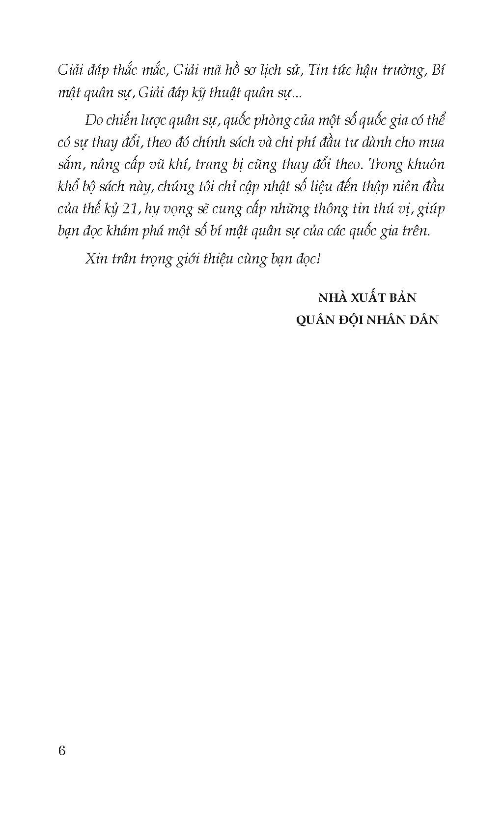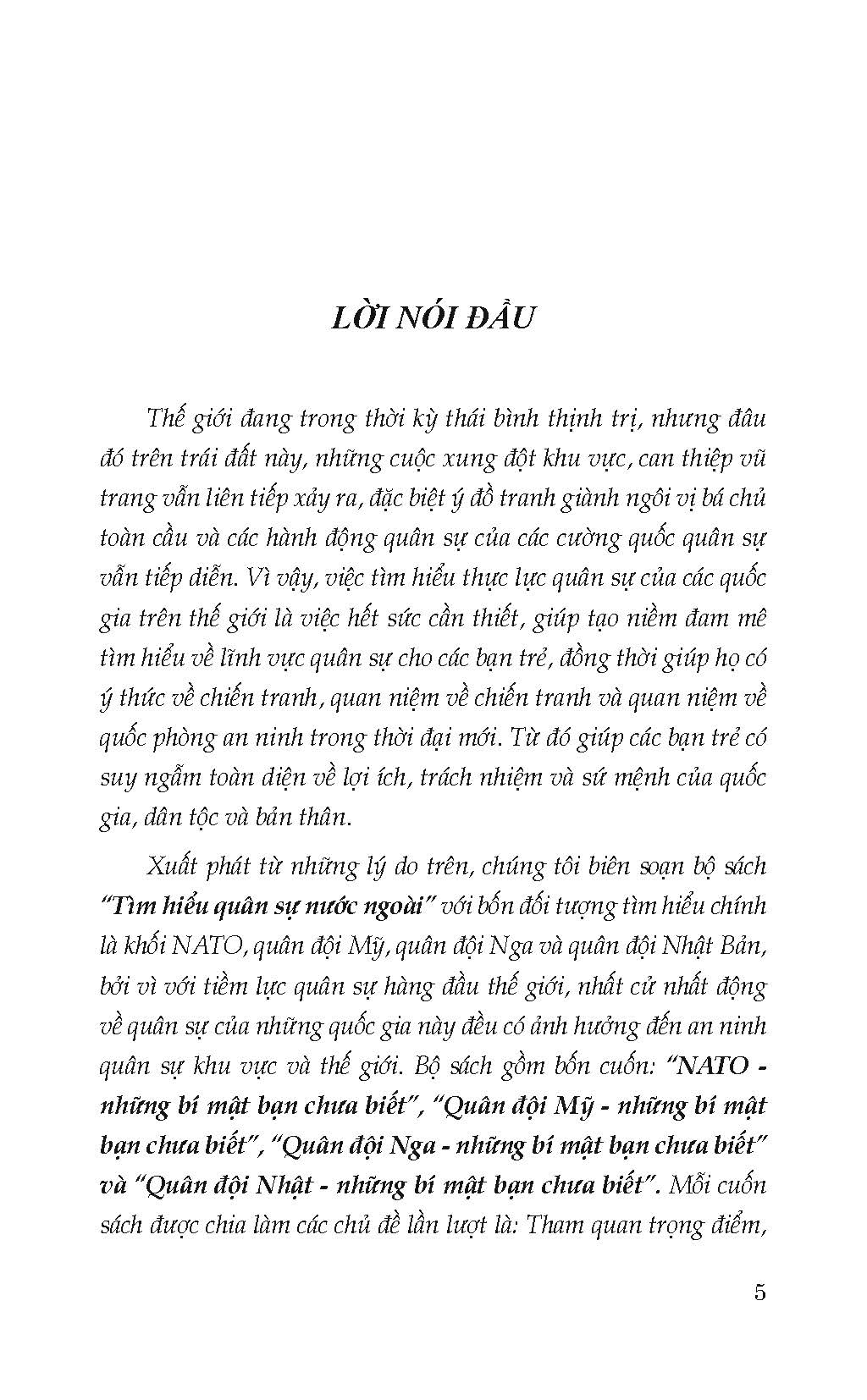 Thế giới đang trong thời kỳ thái bình thịnh trị, nhưng đâu đó trên trái đất này, những cuộc xung đột khu vực, can thiệp vũ trang vẫn liên tiếp xảy ra, đặc biệt ý đồ tranh giành ngôi vị bá chủ toàn cầu và các hành động quân sự của các cường quốc quân sự vẫn tiếp diễn. Vì vậy, việc tìm hiểu thực lực quân sự của các quốc gia trên thế giới là việc hết sức cần thiết, giúp tạo niềm đam mê tìm hiểu về lĩnh vực quân sự cho các bạn trẻ, đồng thời giúp họ có ý thức về chiến tranh, quan niệm về chiến tranh và quan niệm về quốc phòng an ninh trong thời đại mới. Từ đó giúp các bạn trẻ có suy ngẫm toàn diện về lợi ích, trách nhiệm và sứ mệnh của quốc gia, dân tộc và bản thân.         Bộ sách gồm bốn cuốn: “Quân đội Mỹ - những bí mật bạn chưa biết”, “NATO - những bí mật bạn chưa biết”, “Quân đội Nga - những bí mật bạn chưa biết” và “Quân đội Nhật - những bí mật bạn chưa biết”.         Mỗi cuốn sách được chia làm các chủ đề lần lượt là: Tham quan trọng điểm, Giải đáp thắc mắc, Giải mã hồ sơ lịch sử, Tin tức hậu trường, Bí mật quân sự, Giải đáp kỹ thuật quân sự