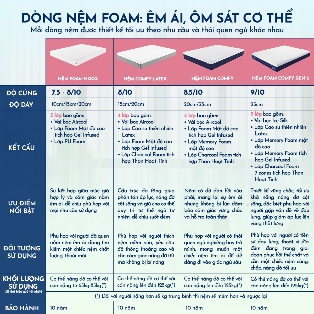 - Sản phẩm nệm Comfy Gen 2 bao gồm: Vải bọc Ice Silk, Cao su thiên nhiên Latex, Memory Foam, Foam tích hợp Gel Infused, Charcoal Foam 7‑Zones tích hợp Than Hoạt Tính.
