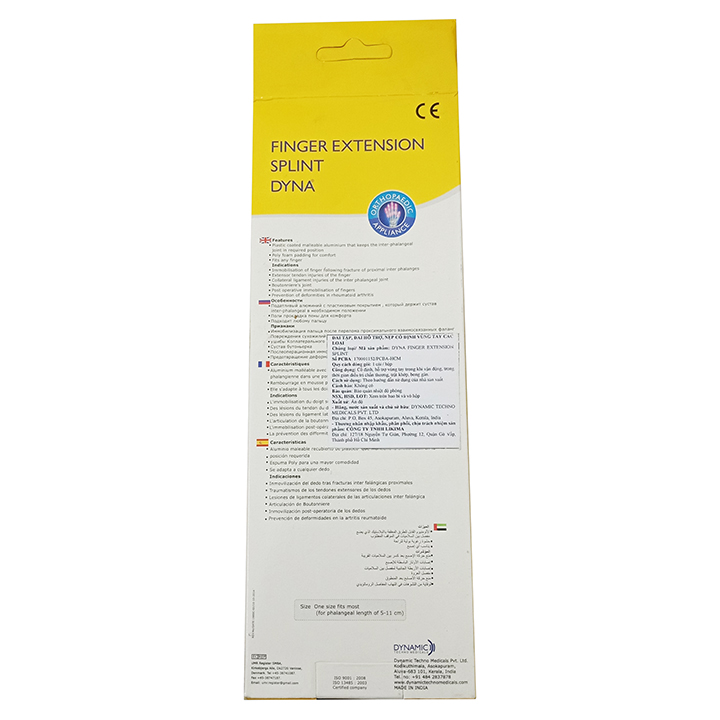 - Hỗ trợ căng cơ, giảm đau Đặc điểm sản phẩm: -Thiết kế miếng nhựa rất dài qua ngón tay bao phủ bởi aluminium -Bên cạnh đó với lớp đệm xốp bên trong hỗ trợ hiệu quả trong điều trị chấn thương ngón tay. Chỉ định sử dụng sản phẩm: -Giúp người dùng cố định các ngón tay sau gãy xương và nội chấn thương ngón tay một cách an toàn và hiệu quả. -Hỗ trợ điều trị tốt nhất trường hợp bị co rút ngón tay do tổn thương thần kinh và sau khi phẫu thuật bất động lâu ngày. -Nẹp ngón tay bị đút cơ gân duỗi, ngón tay bật, ngón tay cò súng. -Hỗ trợ hiệu quả trong sơ cứu ban đầu về chấn thương khớp ngón tay Sản xuất và nhập khẩu: -Sản phẩm đạt tiêu chuẩn CHÂU ÂU do hãng DYNAMIC của Ấn Độ sản xuất xuất khẩu trên 35 nước trên thế giới bao gồm Anh, Mỹ, EU, châu Á... Size của sản phẩm: -Một kích thước phù hợp với hầu hết ngón tay của người sử dụng. Hướng dẫn sử dụng: -Đặt ngón tay bạn muốn điều trị vào giữa 2 dầu kẹp như hình (có thể kẹp trong lúc đi ngủ)