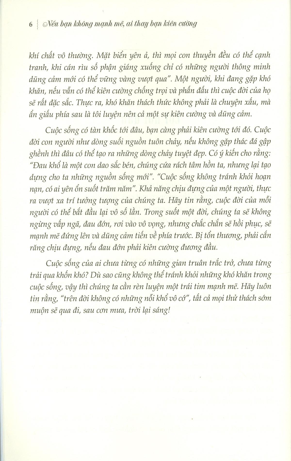 Nếu Bạn Không Mạnh Mẽ, Ai Thay Bạn Kiên Cường Không phải chặng đường nào cũng có người âm thầm ở bên bạn, không phải mỗi vấn đề khó đều có người kịp thời đưa tay giúp đỡ bạ Mong muốn vĩnh viễn núp bóng một ai đó để tránh mưa tránh gió dường như đã trở thành một thứ xa xỉ. Hơn nữa, nếu quả thực có một người tự nguyện che chở cho bạn, thì ai dám đảm bảo rằng, khi cơn bão thực sự ập tới, họ vẫn còn đứng bên bạn? Nếu thực sự muốn mạnh mẽ hơn, chắc chắn sẽ phải trải qua những ngày tháng không có ai giúp đỡ, không có ai ủng hộ. Đừng oán trách những đau khổ đó, chỉ cần cố gắng, tích lũy tất cả kinh nghiệm cuộc sống từ mỗi lần đau khổ, tâm hồn sẽ kết những bông hoa kiên cường.