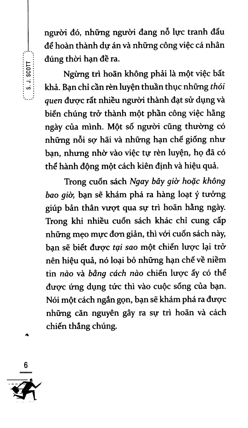 Ngay Bây Giờ Hoặc Không Bao Giờ (Tái Bản 2018) Ngay bây giờ hoặc không bao giờ sẽ giúp bạn khám phá ra hàng loạt ý tưởng giúp bản thân vượt qua sự trì hoãn hằng ngày. Trong khi nhiều cuốn sách khác chỉ cung cấp những mẹo mực đơn giản, thì với cuốn sách này, bạn sẽ biết được tại sao một chiến lược lại trở nên hiệu quả, nó loại bỏ những hạn chế và niềm tin nào và bằng cách nào chiến lược ấy có thể được ứng dụng tức thì vào cuộc sống của bạn… Thành công chỉ thực sự đến khi bạn giữ một lòng kiên trì sắt đá với những mục tiêu đã được đặt ra. Trong cuốn sách này, J. S. Scott đã cung cấp chi tiết những kế hoạch hành động trên mọi lĩnh vực của cuộc sống hằng ngày: từ chăm sóc sức khỏe, thể dục, công việc cho tới các mối quan hệ cá nhân. Không giống như các cuốn sách rèn luyện kỹ năng tầm thường khác, nội dung cuốn sách tập trung tối đa vào hai chữ “hành động”. Vì vậy, thay vì phải đọc những lời khuyên chung chung, bạn sẽ nhận được những phương pháp có thể được thực hiện ngay lập tức nhằm tạo lập những thói quen có thể đánh bại sự trì hoãn .