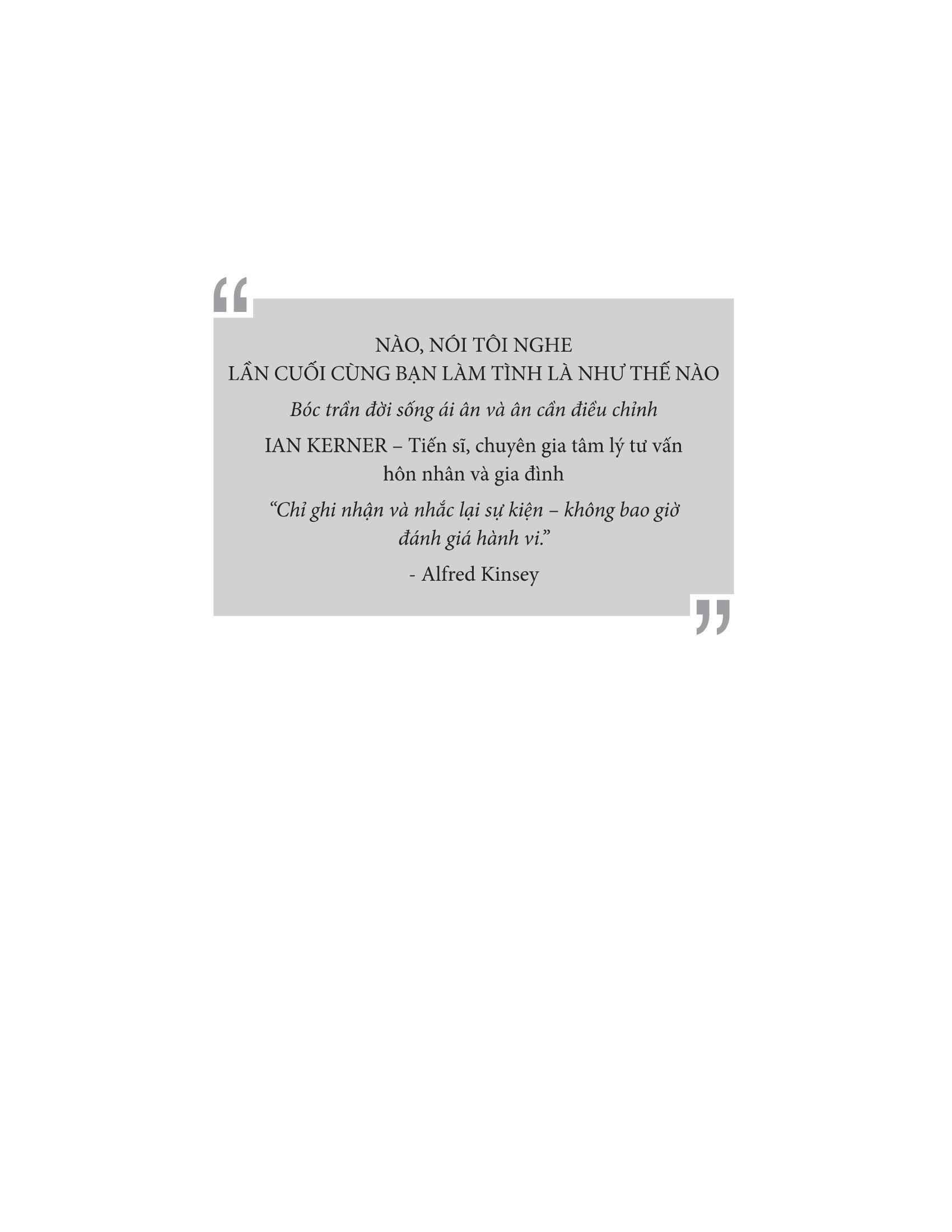 Ở mỗi sự kiện giường chiếu nào cũng có một câu chuyện riêng. Đó có thể là ấn tượng về những chuyện đã xảy ra và những chuyện đã không xảy ra; Về những điều đã nói ra hay những điều không cất thành lời; Về khoái cảm đạt được và những khoái cảm chưa tới.