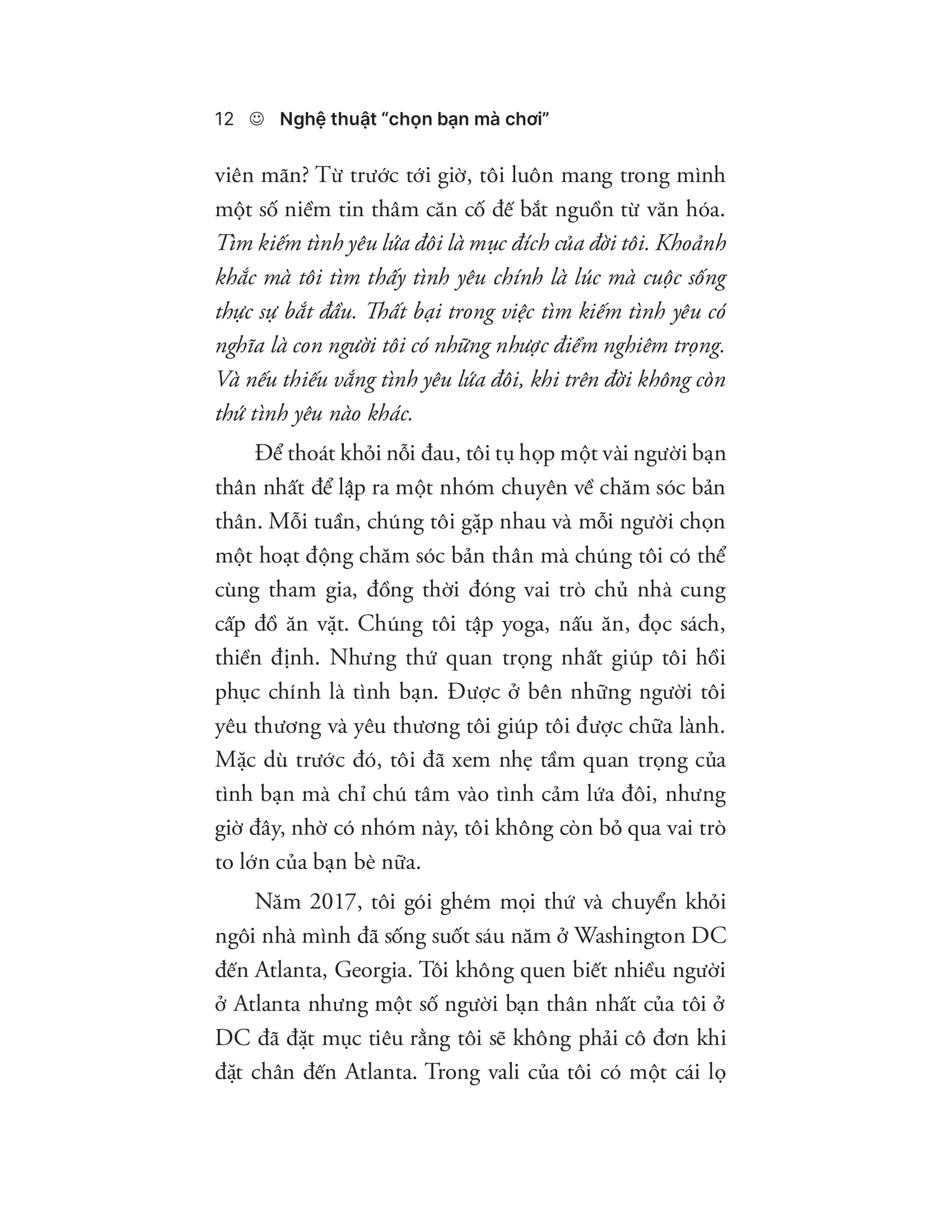 Thách thức trong các mối quan hệ bạn bè: Cuốn sách cũng đề cập đến những thách thức và xung đột có thể xảy ra trong tình bạn, cung cấp các cách thức để giải quyết xung đột và duy trì tình bạn lành mạnh. III. CUỐN SÁCH CÓ GÌ ĐẶC BIỆT Là cuốn sách bán chạy của New York Times, Chọn bạn mà chơi của Tiến sĩ Marisa G. Franco là một tác phẩm sâu sắc và đầy cảm hứng về tầm quan trọng của tình bạn trong cuộc sống hiện đại. Cuốn sách kết hợp giữa lý thuyết khoa học về sự gắn bó và những nghiên cứu mới nhất về tình bạn, cung cấp các hướng dẫn thực tế để tạo dựng và duy trì các mối quan hệ bạn bè bền vững. Tiến sĩ Franco phân tích những lợi ích và thách thức của tình bạn, giúp người đọc hiểu rõ hơn về bản chất của các mối quan hệ này và cách để chúng trở nên sâu sắc và ý nghĩa hơn, mang đến những lời khuyên khôn ngoan, cụ thể và hiệu quả để nuôi dưỡng và làm sâu sắc thêm tình bạn. Trong cuốn sách, tác giả nhấn mạnh tầm quan trọng của tình bạn thuần khiết trong xã hội ngày nay, giúp thay đổi cách nhìn nhận về tầm quan trọng của tình bạn, đồng thời khám phá bản chất chữa lành và nơi trú ẩn an toàn của tình bạn, giúp chúng ta đánh giá cao và không bỏ lỡ những mối quan hệ thuần khiết. Sách cung cấp những hướng dẫn thiết thực để đầu tư vào các mối quan hệ thực sự quan trọng trong cuộc sống, duy trì các mối quan hệ bền chặt – điều quan trọng để có một cuộc sống khỏe mạnh, hạnh phúc.