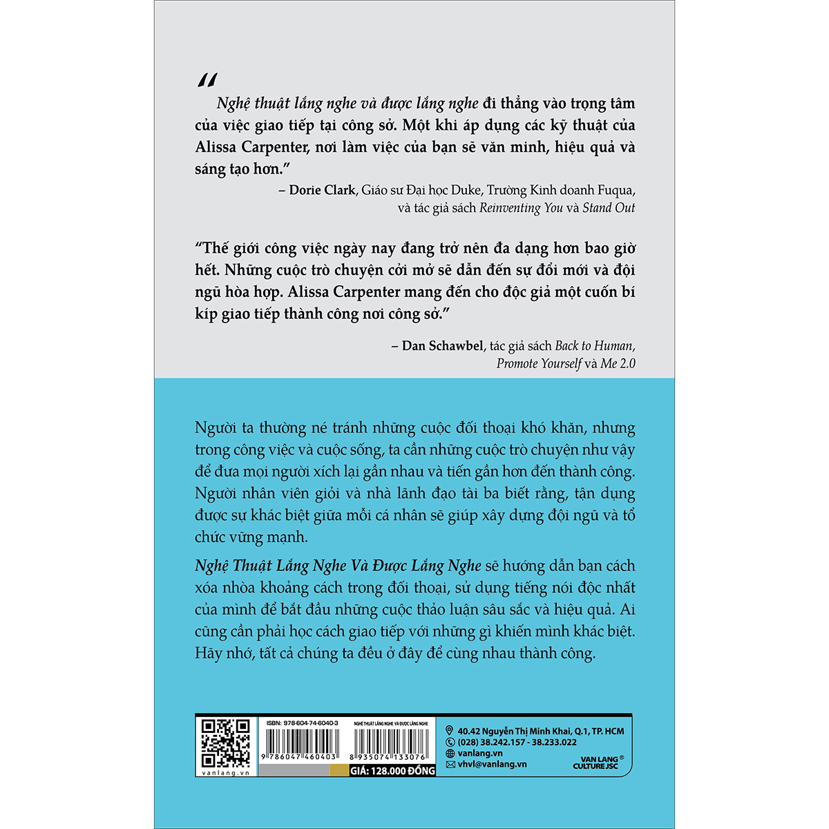 “Nghệ thuật lắng nghe và được lắng nghe đi thẳng vào trọng tâm của việc giao tiếp tại công sở. Một khi áp dụng các kỹ thuật của Alissa Carpenter, nơi làm việc của bạn sẽ văn minh, hiệu quả và sáng tạo hơn.” Người ta thường né tránh những cuộc đối thoại khó khăn, nhưng trong công việc và cuộc sống, ta cần những cuộc trò chuyện như vậy để đưa mọi người xích lại gần nhau và tiến gần hơn đến thành công. Người nhân viên giỏi và nhà lãnh đạo tài ba biết rằng, tận dụng được sự khác biệt giữa mỗi cá nhân sẽ giúp xây dựng đội ngũ và tổ chức vững mạnh.