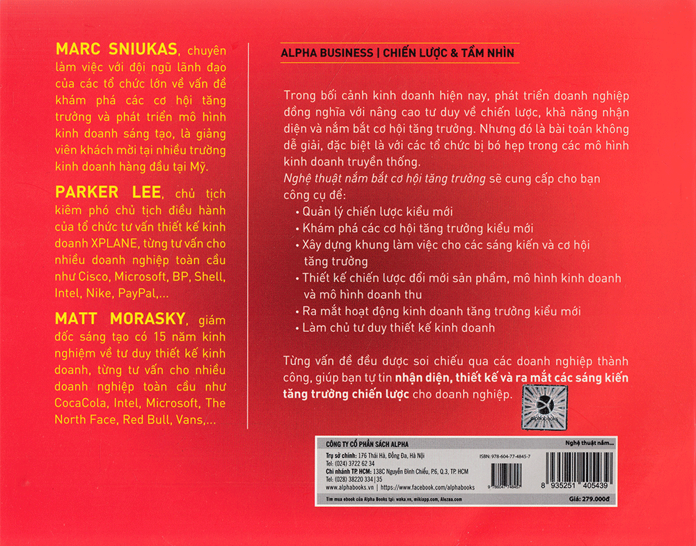 Khám phá và đầu tư vào những cơ hội tăng trưởng chưa bao giờ là bài toán dễ giải, đặc biệt là với các tổ chức đã hoạt động ổn định, bị bó hẹp trong lối tư duy lỗi thời hoặc các mô hình kinh doanh truyền thống. Nghệ thuật nắm bắt cơ hội tăng trưởng sẽ cung cấp cho bạn một lộ trình ngắn nhất để nhận diện, thiết kế và ra mắt các sáng kiến tăng trưởng chiến lược. Marc, Parker và Matt đã xây dựng một hành trình hấp dẫn, nội dung phong phú dành cho bất kỳ ai theo đuổi mục tiêu tăng trưởng mới. Và trong quá trình giới thiệu những cách tư duy mới về chiến lược tăng trưởng và đổi mới chiến lược, ví dụ như nội dung về nhóm phi khách hàng, bản chất nhu cầu của khách hàng cùng các thành tố tạo nên mô hình kinh doanh và mô hình doanh thu, họ cũng giới thiệu với chúng ta những cách làm việc mới. Phương pháp tư duy thị giác và các nguyên tắc tư duy thiết kế kinh doanh khác được thể hiện xuyên suốt cuốn sách sẽ giúp bạn cải thiện cách tiếp cận vấn đề thiết kế và thực hiện chiến lược để phát triển hoạt động kinh doanh tăng trưởng mới. Với sự hỗ trợ của hình ảnh, các công cụ và biểu mẫu, bạn sẽ áp dụng phương pháp này theo đúng nhu cầu của mình. Cuốn sách chia làm 5 chương, giúp từng bước hiểu và xây dựng được cho mình một chiến lược tăng trưởng kiểu mới: Chương 1: Giúp bạn hiểu Chiến lược đổi mới là gì đặt trong sự đối sánh với chiến lược kiểu truyền thống; và 5 nguyên tắc quan trọng của tư duy thiết kế kinh doanh. Đây là những câu hỏi căn bản để bạn thực sự bước chân vào lãnh địa đổi mới chiến lược. Chương 2: Giúp bạn khám phá các cơ hội tăng trưởng kiểu mới bằng việc hiểu rõ nhóm khách hàng và phi khách hàng. Điều quan trọng không kém là hiểu về chính doanh nghiệp của bạn. Từ đó xây dựng khung làm việc cho các sáng kiến và cơ hội tăng trưởng kiểu mới. Chương 3 : Giúp bạn bắt tay vào thiết kế bản chiến lược. Cụ thể là thiết kế chính sản phẩm mà bạn chào bán, xác định mô hình kinh doanh và mô hình doanh thu cho doanh nghiệp mình. Từ đó xác lập chiến lược tăng trưởng cụ thể bằng cách tạo giá trị cho khách hàng, doanh nghiệp và hệ sinh thái. Thể hiện chiến lược dưới dạng hình ảnh cũng là một nghệ thuật cần được quan tâm. Chương 4 : Đi sâu vào 3 giai đoạn thử nghiệm và ra mắt hoạt động kinh doanh tăng trưởng, bao gồm : khởi đầu, phát triển và mở rộng. Chương 5 : Giúp bạn làm chủ nghệ thuật nắm bắt cơ hội tăng trưởng bằng tư duy thiết kế kinh doanh. 5 nguyên tắc của tư duy thiết kế kinh doanh sẽ được làm rõ bằng các dẫn chứng và ví dụ minh họa. Mỗi chương đều có phần hoạt động dành cho các nhóm trong doanh nghiệp để thực hành lý thuyết. Kèm với đó là các doanh nghiệp truyền cảm hứng như Microsoft, Oracle, ProSiebenSat.1, Fahrenheit 212, Câu chuyện của họ thực sự là những bài học hữu ích cho các doanh nghiệp đang cố gắng đổi mới chiến lược tăng trưởng .