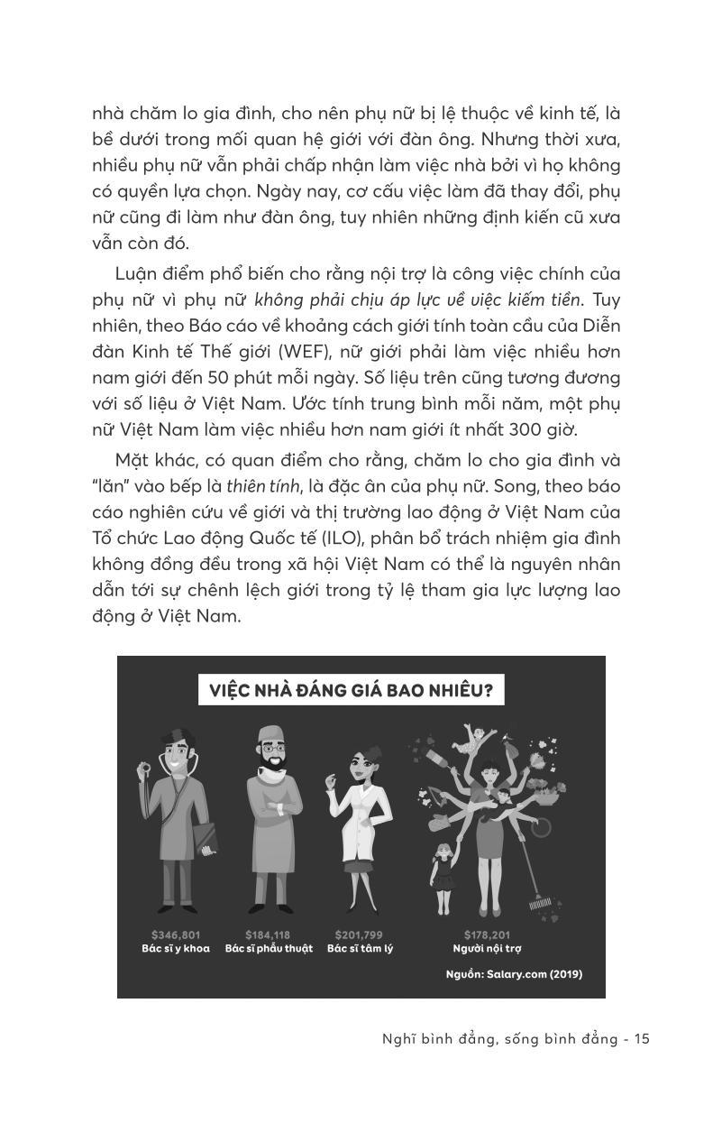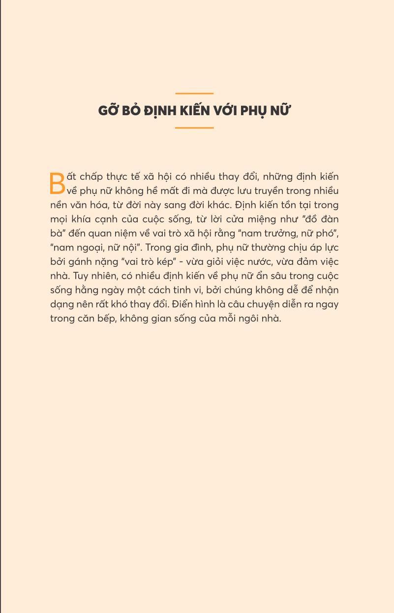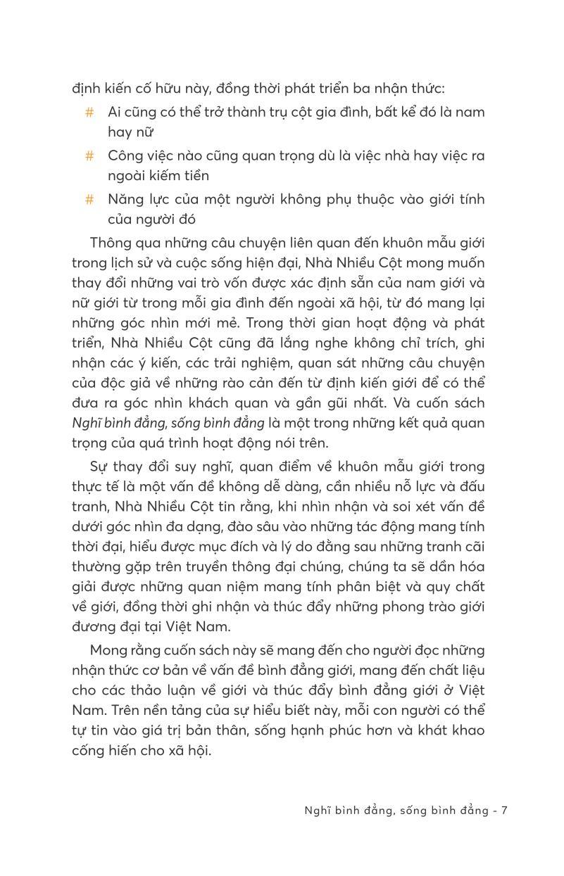 Bạn có biết, định kiến giới là một trong những thứ định kiến lâu đời nhất, dai dẳng nhất, và để lại nhiều hệ lụy nhất? Không chỉ ở Việt Nam mà trên khắp thế giới, định kiến giới vẫn từng ngày len lỏi trong mọi ngóc ngách cuộc sống, vờn bóng đen lên mỗi suy nghĩ, lời nói, hành vi của chúng ta, âm thẩm gây thương tổn cho những người quanh ta? Nhằm mục đích thúc đẩy nhận thức về bình đẳng giới, khuyến khích mỗi cá nhân và cả xã hội vượt qua những định kiến giới, Nghĩ bình đẳng, sống bình đẳng là thành quả sau nhiều năm hoạt động bền bỉ của dự án Nhà Nhiều Cột. Cuốn sách giới thiệu và cập nhật những kiến thức đa dạng, hiện đại về giới và bình đẳng giới, cung cấp tri thức nền tảng về vấn đề giới. Cùng với đó, những phân tích, bình luận về các sự kiện thực tế nóng hổi trên báo chí đương đại cũng có ý nghĩa quan trọng trong việc nhận diện, phê phán các hiện tượng bất bình đẳng giới đang tồn tại. Nhận diện đúng và hiểu đúng về giới, chúng ta sẽ tiệm cận hơn với việc thực hành đúng theo tinh thần bình đẳng giới, góp phần kiến tạo một xã hội tốt đẹp, văn minh và tử tế hơn. NHÀ NHIỀU CỘT Chiến dịch #NhàNhiềuCột nhằm thay đổi nhận thức và hành vi của người trẻ đối với các định kiến giới và thay đổi các sản phẩm quảng cáo để hướng tới mục tiêu bình đẳng giới. Chiến dịch được thực hiện bởi Tổ chức CARE Quốc tế tại Việt Nam và TUVA Communication, với nguồn tài trợ của Investing in Women, một sáng kiến của Chính phủ Australia. Sách được Sakedemy hỗ trợ thực hiện.