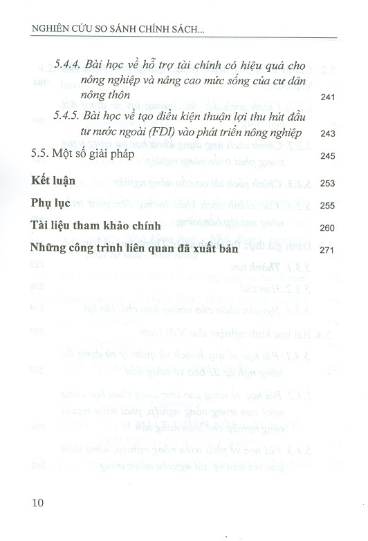 Chương 5 tập trung luận bàn về chính sách phát triển nông nghiệp bền vững của Việt Nam. Qua việc phân tích các quan điểm, chiến lược, chính sách phát triển nông nghiệp bền vững của Việt Nam trên các chiều cạnh: Chính sách đất đai, hướng tới sử dụng bền vững; Chính sách ứng dụng khoa học kĩ thuật và công nghệ trong phát triển nông nghiệp; Chính sách tái cơ cấu nông nghiệp; Chính sách khác hướng tới phát triển nông nghiệp bền vững. Các nhà khoa học đã có nhiều đánh giá tổng quan về thành tựu, hạn chế cũng như các nguyên nhân còn tồn tại dẫn tới các hạn chế trong phát triển nông nghiệp bền vững tại Việt Nam đó là: (1). Hệ thống, cơ chế chính sách phát triển nông nghiệp thiếu tính rõ ràng, đột phá; (2). Môi trường kinh doanh nông nghiệp quá thấp; (3). Đầu tư từ ngân sách nhà nước và các thành phần kinh tế vào nông nghiệp, nông dân, nông thôn còn thấp, chưa đáp ứng được nhu cầu phát triển. Qua đó, các tác giả đã rút ra một số bài học kinh nghiệp cho phát triển nông nghiệp Việt Nam, tập trung vào bài học về quy hoạch và quản lý sử dụng đất nông nghiệp để bảo vệ nông dân; bài học về nâng cao ứng dụng khoa học công nghệ trong nông nghiệp, phát triển ngành công nghiệp chế biến nông sản; bài học về phát triển nông nghiệp, nông thôn gắn với bảo vệ tài nguyên môi trường; bài học về hỗ trợ tài chính có hiệu quả cho nông nghiệp và nâng cao mức sống của cư dân nông thôn; bài học về tạo điều kiện thuận lợi thu hút đầu tư nước ngoài (FDI) vào phát triển nông nghiệp. Đồng thời, các tác giả cũng gợi ý các giải pháp để phát triển nông nghiệp hướng tới việc đổi mới mô hình tăng trưởng, tiếp tục cái cơ cấu nông nghiệp theo hướng nâng cao giá trị gia tăng phát triển bền vững gắn với xây dựng nông thôn mới; Thực hiện quy hoạch nông nghiệp theo hướng dựa vào thị trường mở, để bảo tồn diện tích nông nghiệp; Đẩy mạnh sản xuất lương thực, thực phẩm ở các vùng sâu, vùng xa; Nâng cao năng lực quản lý và ứng phó rủi ro liên quan đến thời tiết và giảm thiểu tác động của biến đổi khí hậu cũng như các rủi ro về thị trường; Tăng cường đầu tư công vào các công trình phòng chống thiên tai, giảm tác động bất lợi về môi trường…