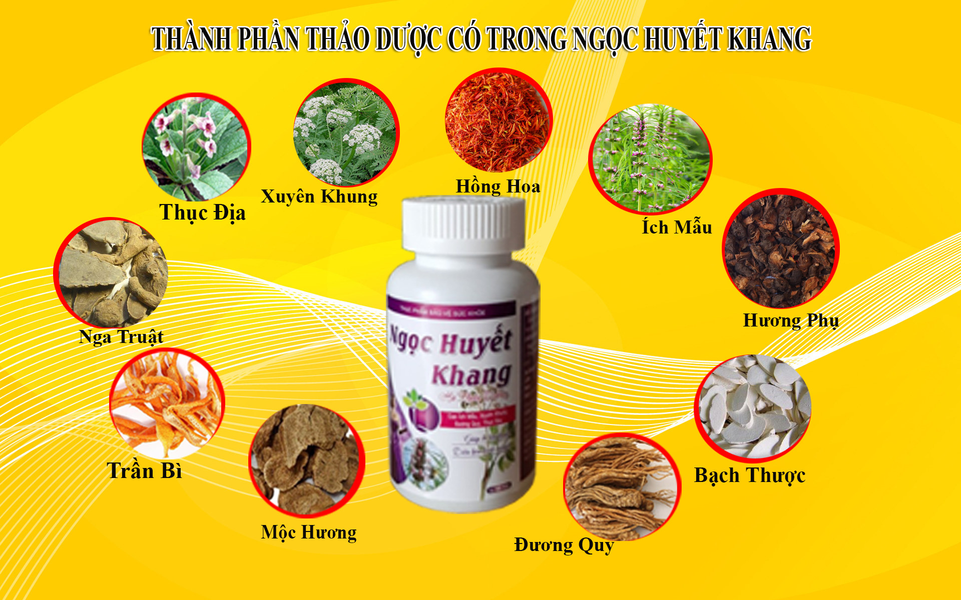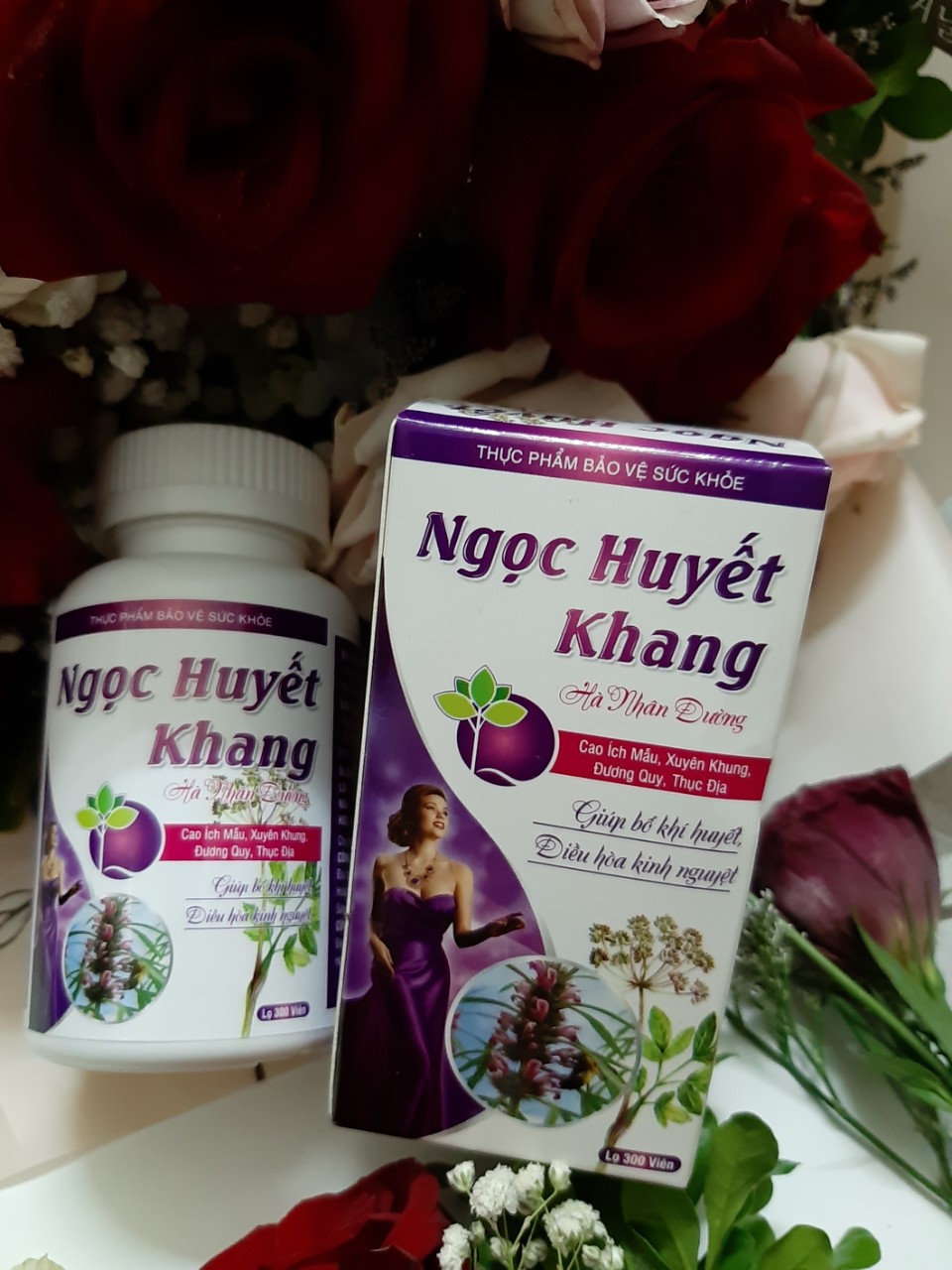 Ngọc huyết khang: Công dụng: Giúp bổ khí huyết, điều hòa kinh nguyệt. Hỗ trợ kinh nguyệt không đều, rồi loạn kinh nguyệt, chậm kinh, bí kinh, đau bụng kinh, rong huyết, đau thắt lưng trước và sau khi hành kinh. Khí hư bạch đới Hồi phục tử cung sau sinh Phụ nữ thiếu máu, da xanh, sắc mặt kém tươi Giúp điều hòa kinh nguyệt, tăng nội tiết tố, trứng chắc, trứng khỏe, tăng khả năng đậu thai. Giảm đau bụng kinh, khí huyết lưu thông kém, máu thâm cục. Giảm các triệu chứng tiền mãn kinh: Bốc hỏa, vã mồ hôi, hay cáu gắt, hồi hộp, lo lắng, đánh trống ngực, khô âm đạo, suy giảm ham muốn, đau rát khi yêu, mất ngủ, sạm da, tóc rụng, thân hình xồ xề, dung nhan suy giảm. Giúp ăn ngon, ngủ tốt, đẹp da, giảm khô hạn, tăng ham muốn. Cách sử dụng: