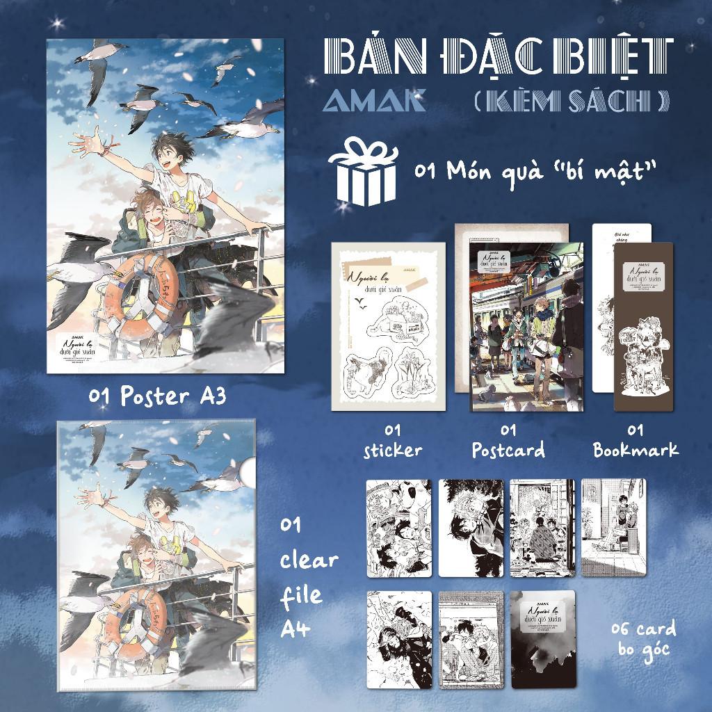 Bản đặc biệt: 01 bookmark, 01 postcard, bộ 6 card bo góc cán màng ánh trai, 01 sticker, 01 clearfile A4, 01 poster A3 và một món quà bí mật tri ân độc giả đầu năm mới 2023 (số lượng có hạn)