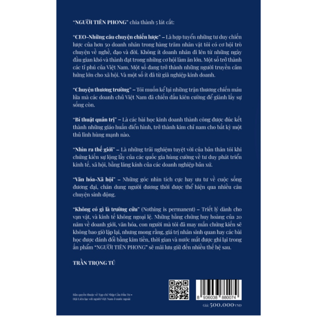 “Không có gì là trường cửu” (Nothing Is Permanent) – triết lý của vạn vật, và kinh tế không ngoại lệ. Những câu chuyện “Người Tiên Phong” có thể chỉ còn là hồi ức, có thể vẫn còn nguyên giá trị đến hôm nay, hoặc có thể đã phát triển, thăng hoa theo những cung bậc khác nhau, nhưng giá trị nhân sinh quan và các bài học được đánh đổi bằng kim tiền, thời gian, nước mắt được ghi lại trong ấn phẩm này sẽ mãi là bằng chứng sống của thời gian. 20 năm qua, doanh nhân đất Việt không phải lúc nào cũng gặp được thiên thời, địa lợi, nhân hòa. Cuộc khủng khoảng kinh tế 2008 và dịch bệnh toàn cầu năm 2020 đã giáng những đòn mạnh mẽ vào thành quả hàng chục năm xây dựng của giới doanh chủ, làm hao mòn sinh lực của nhiều cá nhân và tập thể kinh doanh danh tiếng. Một số lãnh đạo doanh nghiệp tài năng bị trượt ngã trên đường chạy, thậm chí một vài trong số họ vướng vào vòng lao lý. Nhưng cũng 20 năm qua, đất nước đã chứng kiến những thay đổi xán lạn của tầng lớp doanh nhân hồng chuyên với tâm-trí-tài, sẵn sàng đương đầu với thử thách, trong môi trường kinh doanh năng động, máu lửa. Ấn phẩm sách với tên gọi “Người Tiên Phong” mang 2 ý nghĩa. Trước hết, nó phản ánh nguyên tắc thương trường, đồng thời nhắc nhớ sự tương quan giữa “kinh doanh” và “đạo đức”. Bên cạnh đó, người lãnh đạo doanh nghiệp cũng cần phải có đủ bản lĩnh để gánh vác sự thành bại của tập thể, không khác vai trò “tiền đạo” trong các trận cầu.