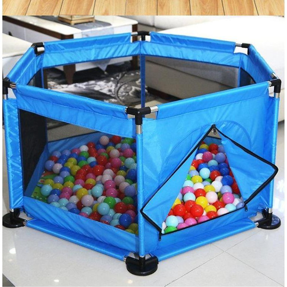 - Quây bóng có kích thước lớn để bé ngồi chơi bên trong vô cùng an toàn như một chiếc cũi lớn. Vừa giúp các bậc phụ huynh rảnh tay hơn, để làm những công việc nội trợ khác.