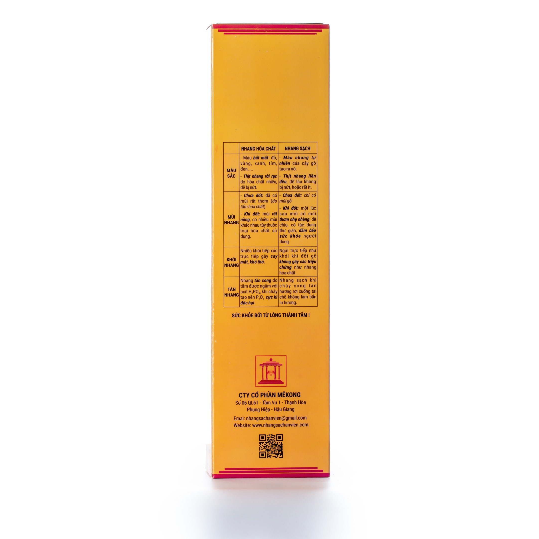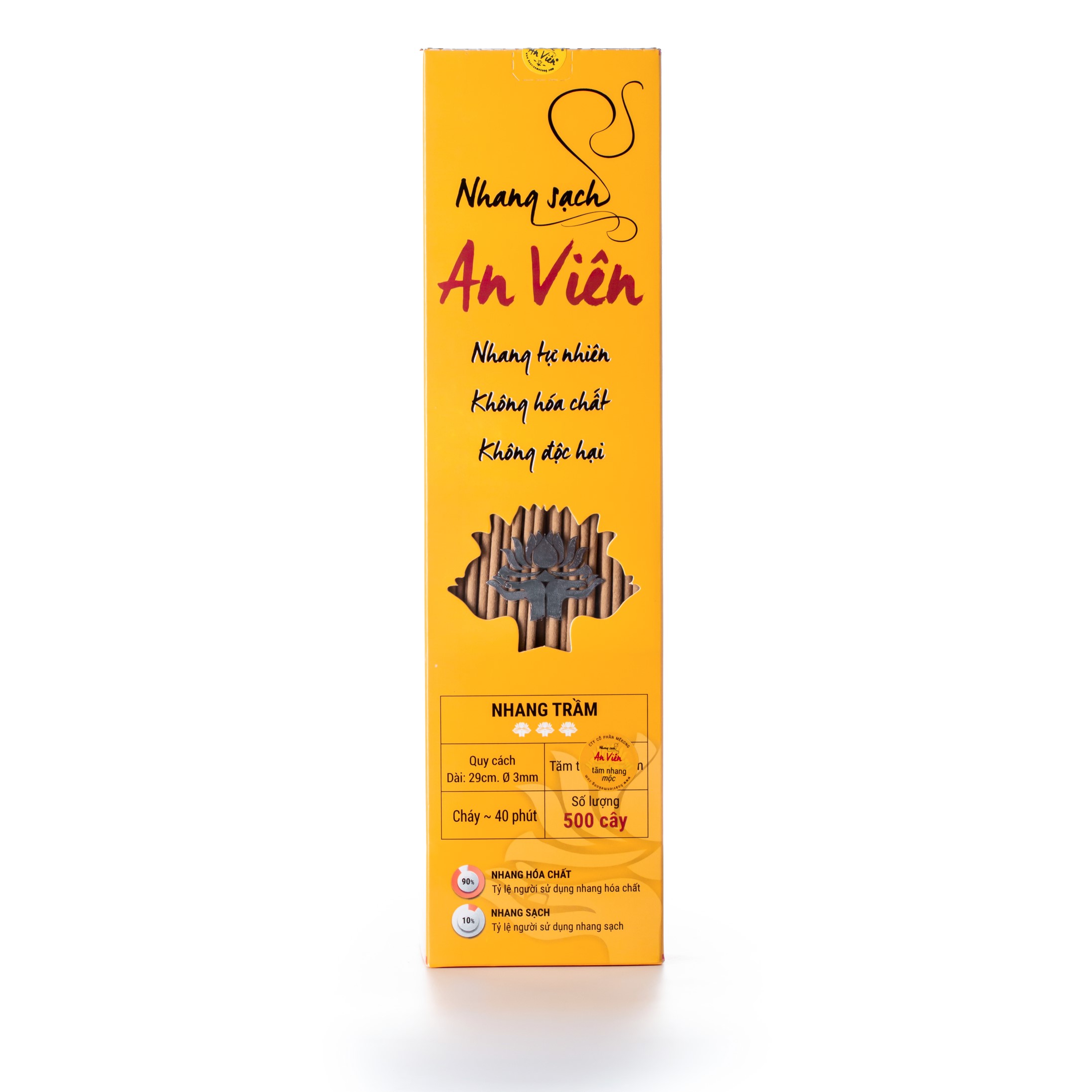 Nhang trầm An Viên 3 tấc (hộp 500 cây) Nguyên liệu: Bột trầm tự nhiên kết hợp với keo bời lời tự nhiên. Quy cách: đường kính 3mm - Dài: 29,5cm. Tăm tre nhập khẩu Đài Loan Thời gian cháy: ~ 45 phút/ cây (tùy điều kiện gió) Thích hợp sử dụng trong phòng kín, máy lạnh, tốt cho sức khỏe. Đặc biệt là nhà có trẻ nhỏ, không gây hại đường hô hấp, khí quản, tim mạch