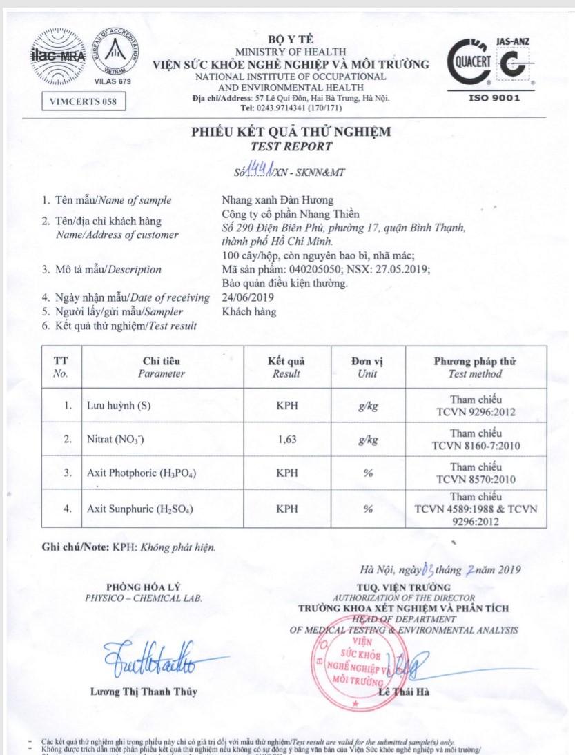 - An toàn cho sức khoẻ Sản phẩm được kiểm định bởi Sở Khoa Học & Công Nghệ TP.Hồ Chí Minh. Đạt chuẩn QCVN 19:2009/ BTMNMT và TCVN 6994:2001. An toàn cho mắt & phổi. 3.Thương hiệu uy tín Sản phẩm Nhang Sạch đầu tiên được VTV1 và Nông Nghiệp Sạch công nhận. Là sản phẩm Nhang duy nhất có mặt trong hệ thống siêu thị: LotteMart, Aeon, Emart.