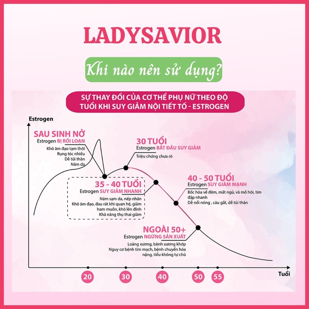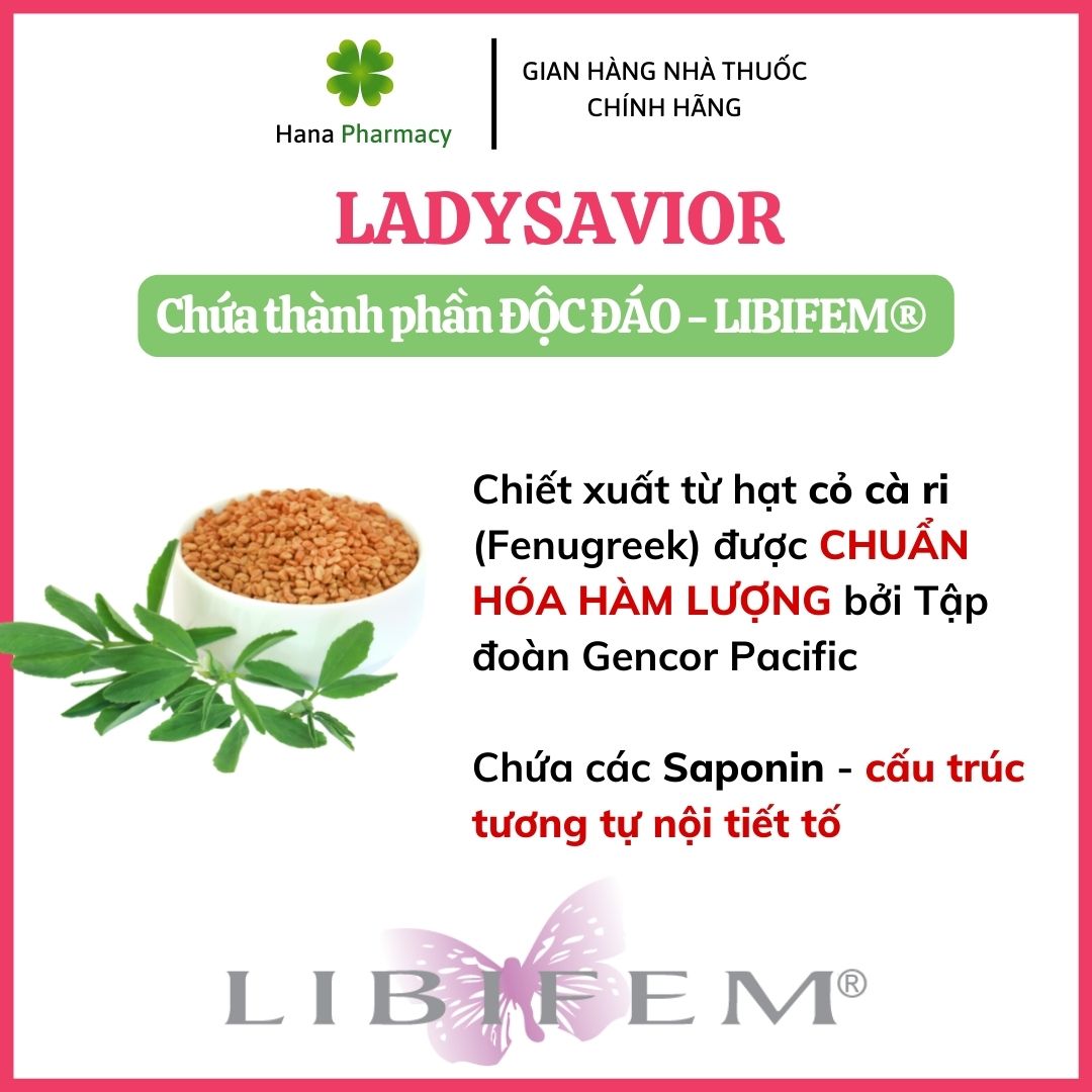 Viên uống Ladysavior có chứa các thành phần hợp chất tự nhiên có tác dụng bổ sung nội tiết tố, giảm các triệu chứng khó chịu như bốc hỏa, mất ngủ, đổ mồ hôi, lão hóa da do suy giảm nội tiết tố ở phụ nữ mãn kinh và tiền mãn kinh. LadySavior là viên uống hỗ trợ giảm các triệu chứng khó chịu như bốc hỏa, mất ngủ, đổ mồ hôi, lão hóa da do suy giảm nội tiết tố ở phụ nữ mãn kinh và tiền mãn kinh. Bên cạnh đó, LadySavior còn bổ sung các dưỡng chất cần thiết cho da và cơ thể, giúp duy trì sắc đẹp và tăng cường sức khỏe nữ giới. Thành phần chính của viên uống Ladysavior bao gồm: Libifem 200mg là chiết xuất tinh chất từ hạt cỏ cà ri (Fenugreek) được nghiên cứu và chuẩn hóa bởi tập đoàn Gencor Pacific. Libifem cũng đã được chứng minh lâm sàng giúp giảm các triệu chứng khó chịu ở phụ nữ tiền mãn kinh và mãn kinh. Dầu hoa anh thảo (Evening Primrose) 250mg là thành phần thiên nhiên có lịch sử lâu đời giúp giảm các triệu chứng tiền mãn kinh, mãn kinh, giảm khô da, tăng độ đàn hồi của da và duy trì sắc đẹp. Chiết xuất hoa hồng Damask 100mg từ loại hoa hồng cao cấp giúp thư giãn và tăng cường sức khỏe nữ giới. Vitamin E 400 IU giúp làm đẹp da, dưỡng tóc và cân bằng nội tiết tố nữ. Biotin 0.04mg và Selen 0.028mg là dưỡng chất cần thiết, mang lại vẻ đẹp khỏe khoắn cho làn da và mái tóc. Bên cạnh đó, LadySavior được sản xuất bằng công nghệ bào chế hiện đại dưới dạng viên phức hợp với thành phần chính Libifem phân tán trong hỗn hợp tinh dầu thiên nhiên giúp bảo vệ các tinh chất ở dạng thuần khiết cũng như phát huy tối đa hiệu quả của mỗi thành phần. Hiệu quả: Libifem là thành phần chính mang lại hiệu quả vượt trội của viên uống LadySavior. Đây là hỗn hợp các saponin với cấu trúc tương tự như nội tiết tố được chiết xuất từ hạt cỏ cà ri (Fenugreek). Trong y học cổ truyền Hy Lạp, Ấn Độ và Trung Quốc, hạt cỏ cà ri đã được sử dụng từ hàng ngàn năm, giúp tăng tiết sữa, giảm đau bụng kinh và cải thiện chức năng sinh lý ở nữ giới thông qua khả năng cân bằng nội tiết tố. Cho đến khi được nghiên cứu và chuẩn hóa bởi Tập đoàn Gencor, chiết xuất cỏ cà ri hay Libifem đã chứng minh được ưu thế trong việc cải thiện chất lượng cuộc sống ở nữ giới và giành được giải thưởng “Thành phần mới lạ nhất” tại triển lãm các thành phần tự nhiên Natural Products Expo West năm 2013. Bên cạnh đó, sản phẩm cũng được cấp bằng độc quyền sáng chế tại châu Âu và Hoa Kỳ. Về hiệu quả, nghiên cứu lâm sàng tại Úc trên 115 phụ nữ từ 40 - 65 tuổi trong 12 tuần đã chỉ ra rằng, chiết xuất hạt cỏ cà ri trong viên uống LadySavior giúp giảm trên 50% tần suất xuất hiện triệu chứng nóng bừng và đổ mồ hôi trộm sau 12 tuần. Bên cạnh đó, Libifem còn giúp tăng chất lượng cuộc sống của người dùng. Sản phẩm này không phải là thuốc và không có tác dụng thay thế thuốc chữa bệnh