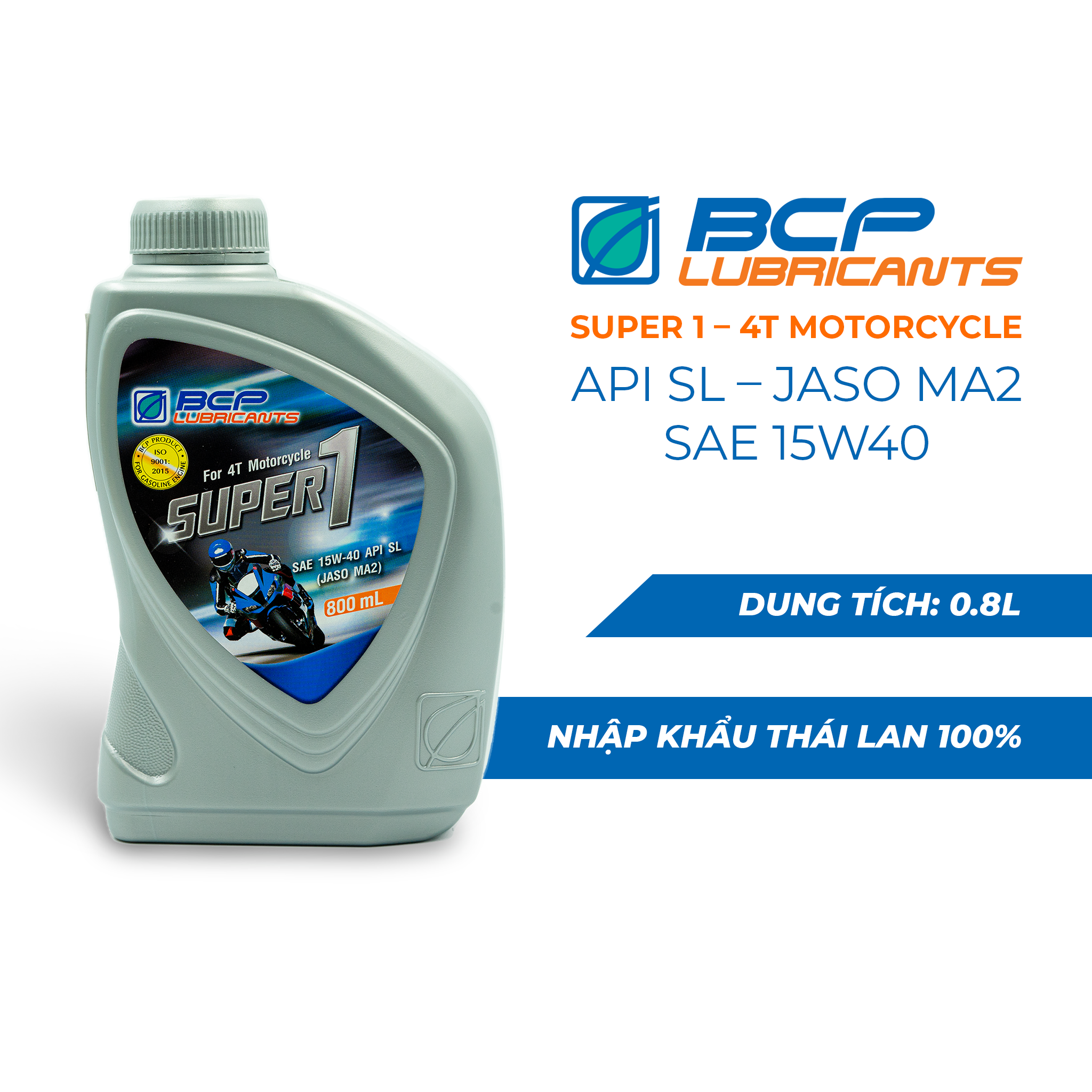 Nhớt xe số BCP Super 1 - SAE 15W40 - API SL - JASO MA2 – chai 800 mL BCP Super 1 4T Motorcycle là sản phẩm dầu nhớt đa cấp tổng hợp chuyên dùng cho tất cả các dòng xe số động cơ 4 thì. Nhớt xe số BCP Super 1 phiên bản chai 800 ml tiện dụng được sản xuất từ dầu gốc cao cấp và phụ gia đặc biệt, đáp ứng tiêu chuẩn chất lượng quốc tế API SL và JASO MA2 theo yêu cầu riêng dành cho xe số của Hiệp hội Dầu nhớt Hoa Kì và Cơ quan Tiêu chuẩn phương tiện cơ giới Nhật Bản. LỢI ÍCH SẢN PHẨM:
