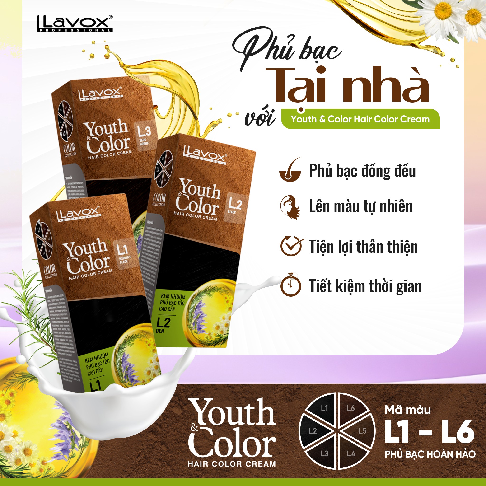 Kem nhuộm Lavox Youth&Color mang đến cho bạn giải pháp nhuộm tóc tại nhà tiện lợi, nhanh chóng; đảm bảo an toàn với thành phần chiết xuất từ thiên nhiên. Không gây khô xơ và