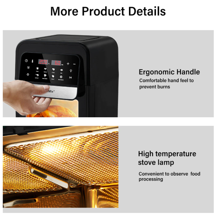 - Dễ sử dụng: Khoai tây chiên, cánh, bít tết, cá, tôm, rau, bánh mì nướng, khử nước …… Chỉ cần chạm và sử dụng! Màn hình cảm ứng tiên tiến linh hoạt cho phép bạn nấu các món ngon khác nhau một cách dễ dàng. Ngoài ra, máy sấy khô này còn được trang bị dải nhiệt độ rộng từ 50 đến 200 độ C và chế độ hẹn giờ nấu từ 0-60 phút.